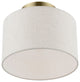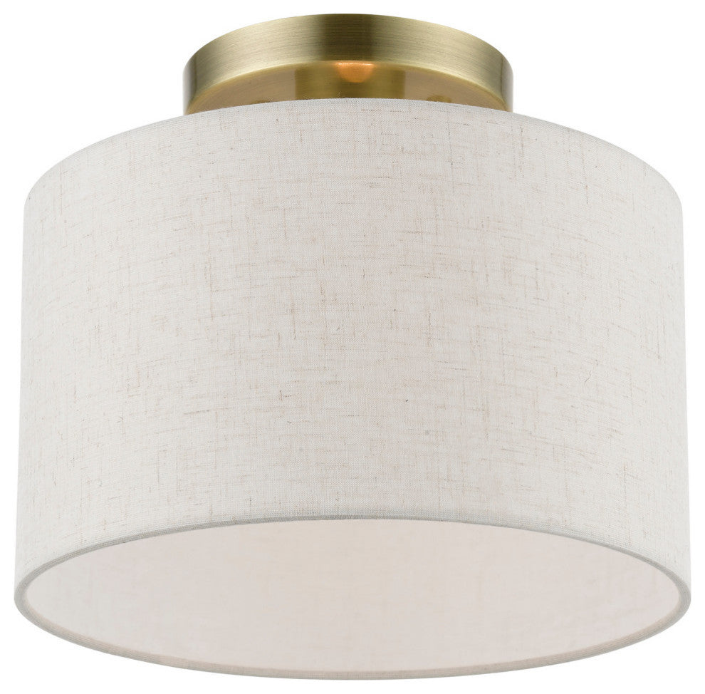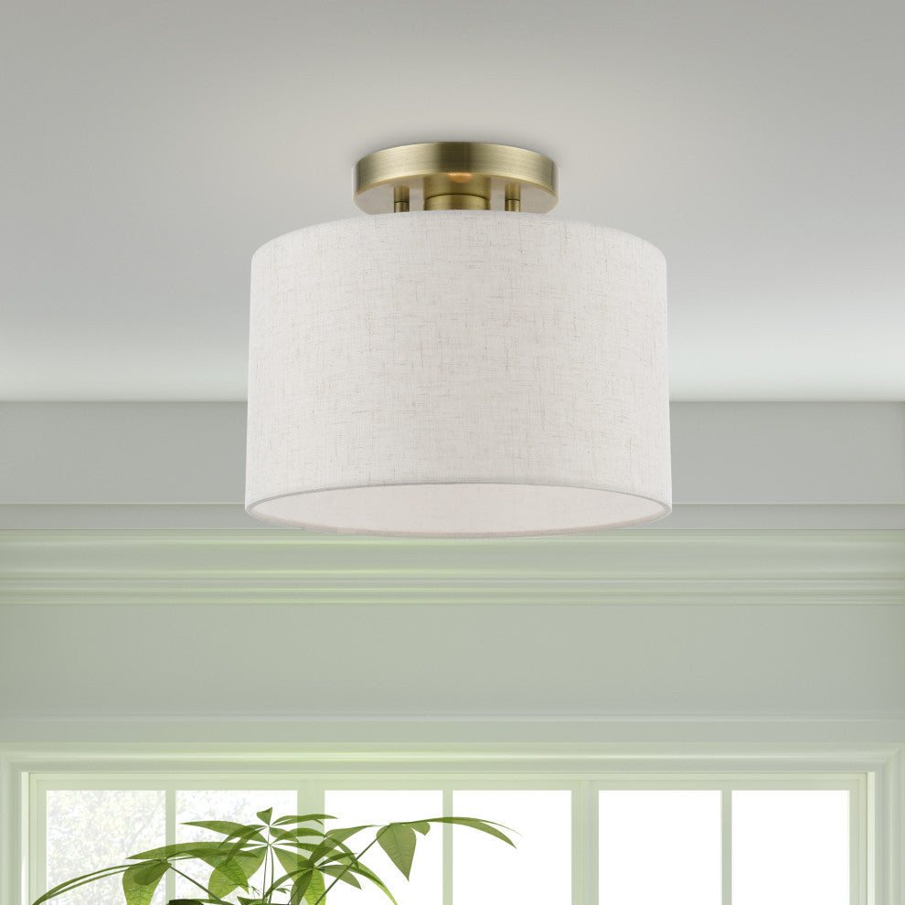 The Meadow collection is both modern and versatile. The hand-crafted fabric oatmeal colored hardback shade is set off by the silky white fabric on the inside setting a pleasant mood. The small size single-light drum shade adds character to this handsomely styled semi flush. Perfect fit for the hallway, bathroom, kitchen and a small bedroom. This sleek design is shown in an antique brass finish.