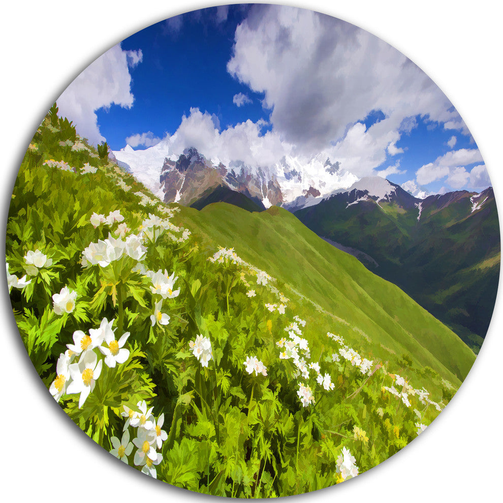 Blossom Flowers In Mountains, Landscape Disc Metal Artwork, 23"