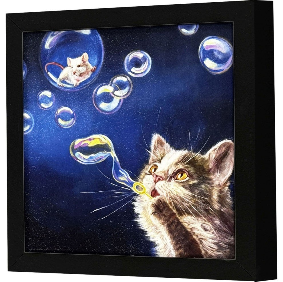 A quirky animal print provides a touch of humor. Featuring a hand applied enhanced gel finish and framed in a modern flat black molding.