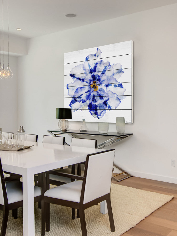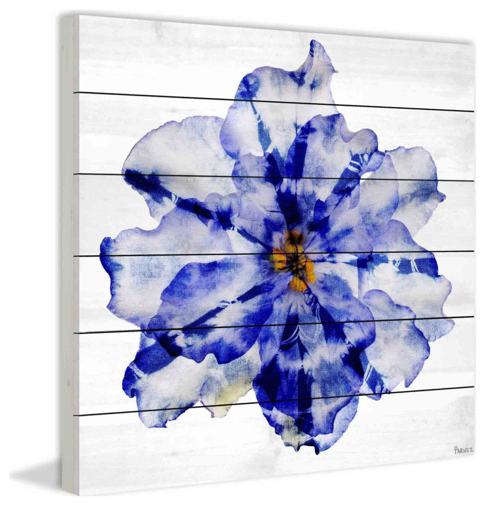 Striking and unique, the "Blue and White Flower" UV Ink Print on White Wood by Parvez Taj will bring your walls to life. Printed on white pine wood, this 32 inch wide by 32 inch tall contemporary artwork will make a statement in any living room, dining room, or bedroom.- Fine art UV ink print on white wood by Parvez Taj- wood pieces are hand-selected by Fine craftsmen for printing- Arrives ready to hang- Includes a certificate of authenticity- Artist signature on the front