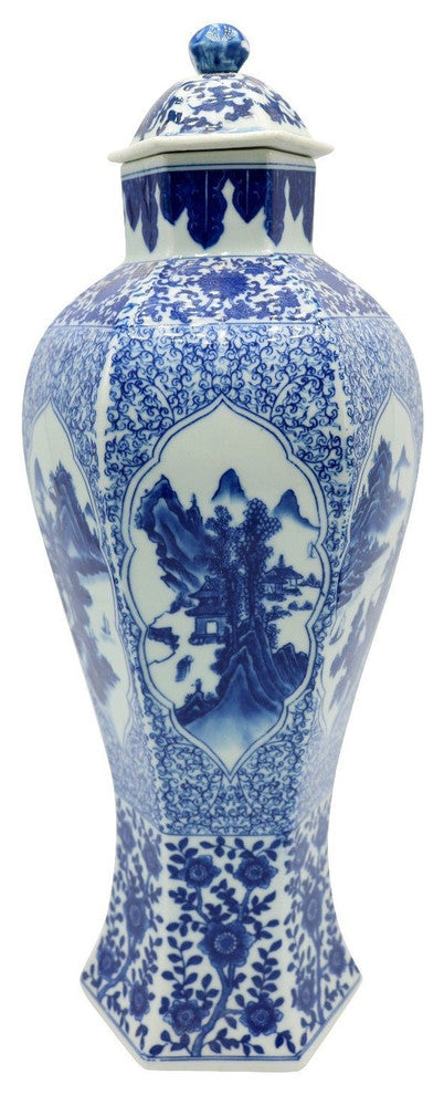 Blue and White Hexagonal Landscape Porcelain Temple Jar 16"