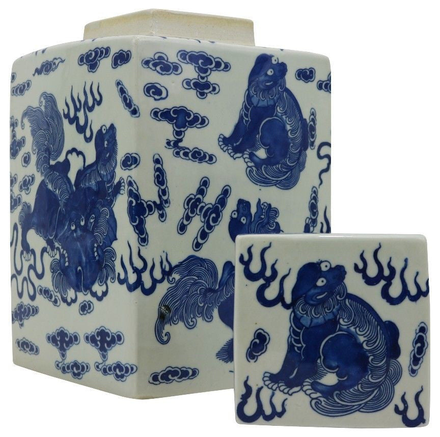 Blue and White Square Chinese Porcelain Ginger Jar Foo Dog Motif 11"