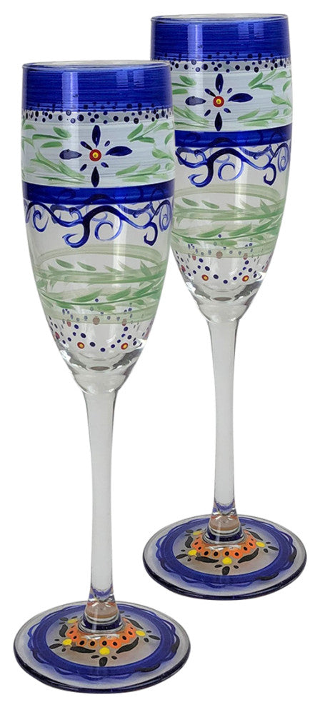 Blue Floral Champagne Glasses, Set of 2