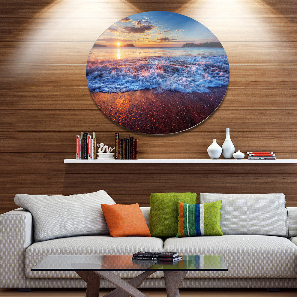 Bring Contemporary Abstraction to your home with this large Circle Metal wall art. This Blue Sea Waves during Sunset Metal Artwork makes it the focal point of any room or office.