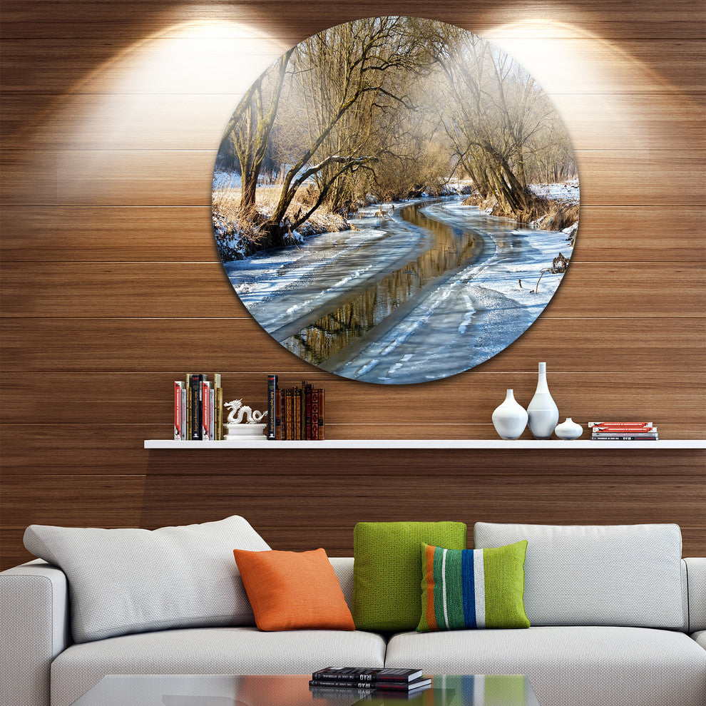 Bring Contemporary Abstraction to your home with this large Circle Metal wall art. This Blue Sunny Day in Winter Landscape Metal Artwork makes it the focal point of any room or office.