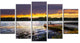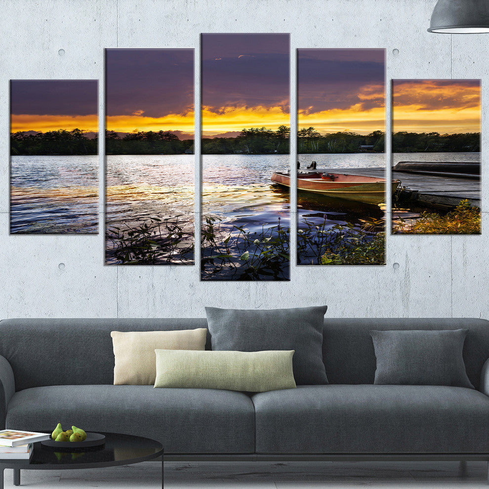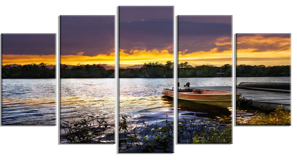"Boat Docked in Lake At Sunset" Modern Seashore Canvas Art, 5 Panels, 60"x32"