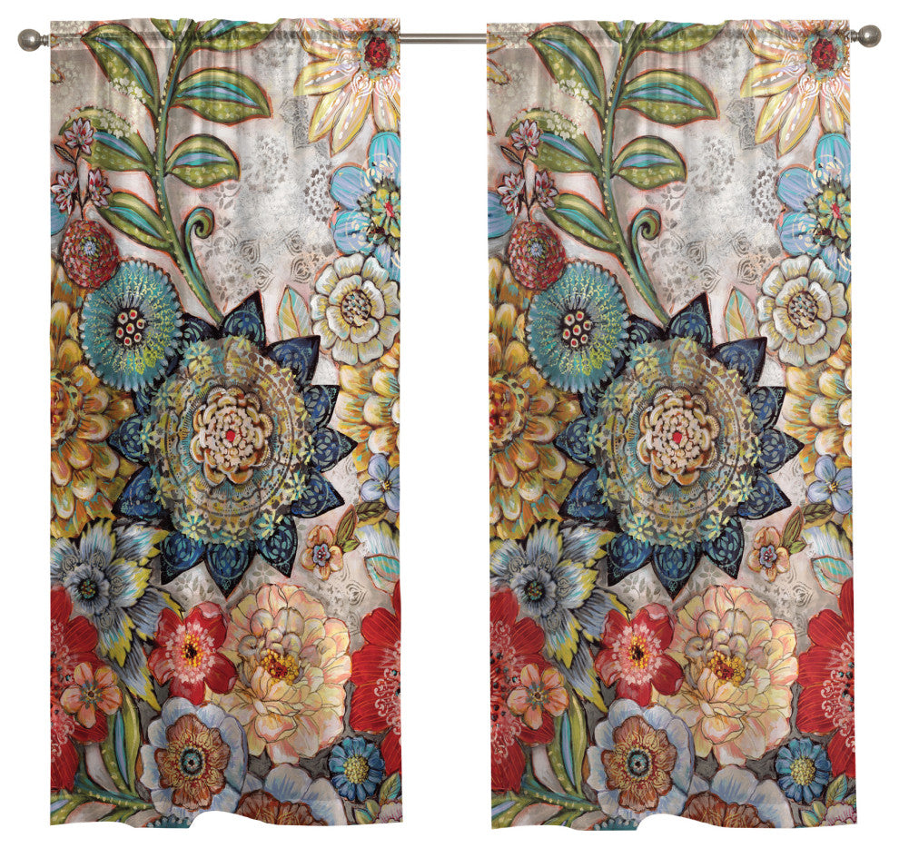 This floral, boho inspired room darkening window panel, "Boho Bouquet," displays a unique and stylish design. Featuring hand painted, multicolor flowers, the design transforms into a vibrant, colorful look. "Boho Bouquet" will surely add a bohemian flair to any home.