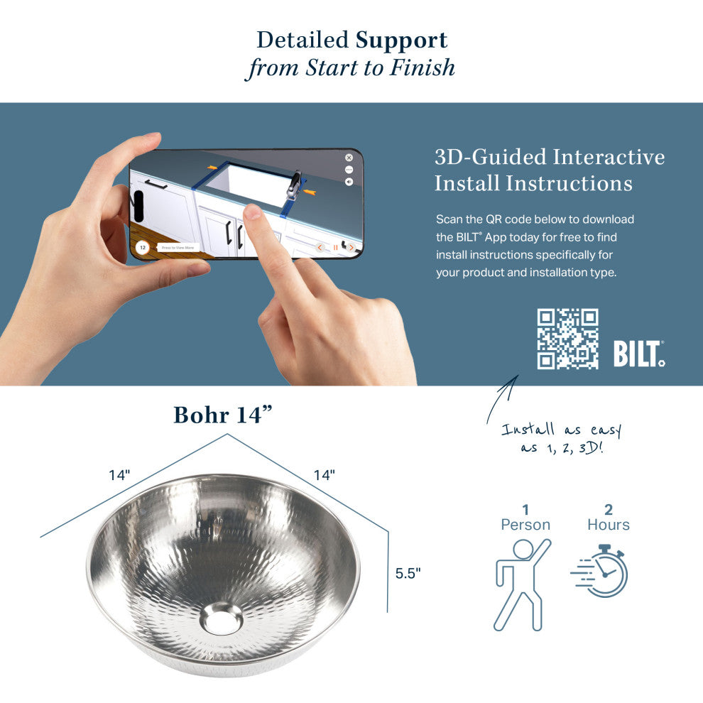 When you"™re looking to make a statement in your bathroom, a nickel vessel sink always makes a splash. The Bohr vessel nickel bath sink is striking and eye-catching. Vessel sinks also provide more countertop space - both above and below your vanity. This durable, solid hammered brass sink is nickel-plated by skilled craftsman for beauty and strength, and is protected by our lifetime warranty.Dimensions: 14" x 14" x 5.5"Vessel design sits atop a vanity and provides max countertop space - above and belowHand-hammered, solid 18-gauge brass plated in nickel sink is protected by our lifetime warrantyNickel-plated brass gives a luxurious, high-impact shineRecommended Products: SinkSense 1.5" Pop-Up Sink Drain in Nickel - No Overflow (#P15-N)SinkSense 1.5" Grid Sink Drain in Nickel - No Overflow (#G15-HN)Stainless Steel Care IQ Kit (#SARMOR-701)