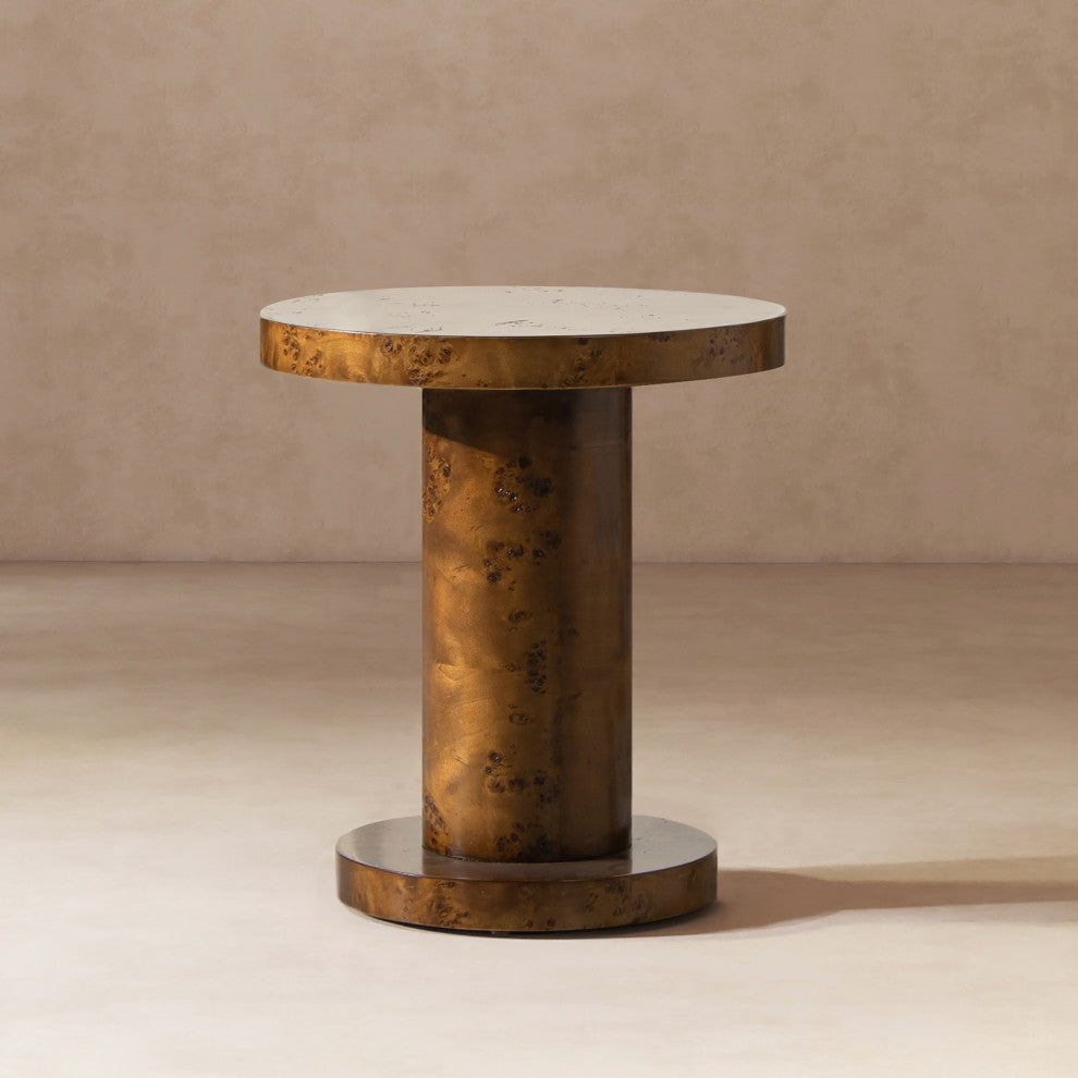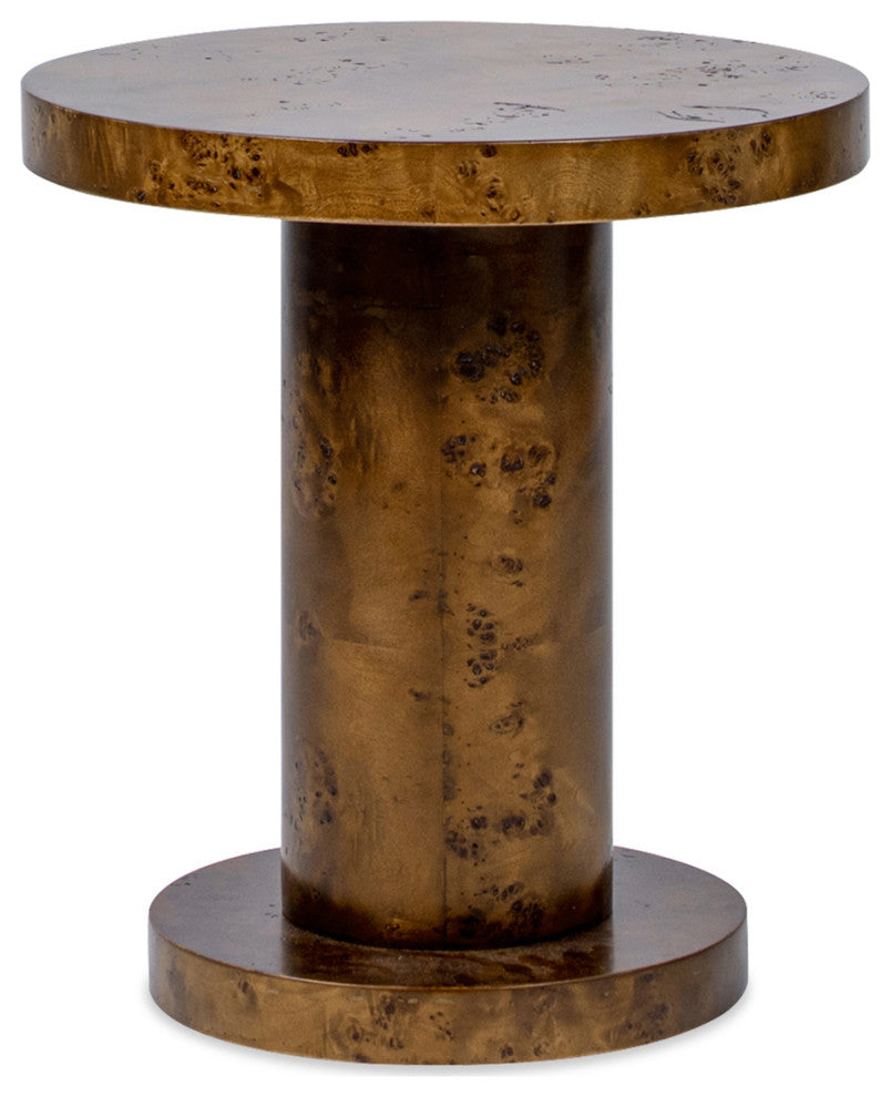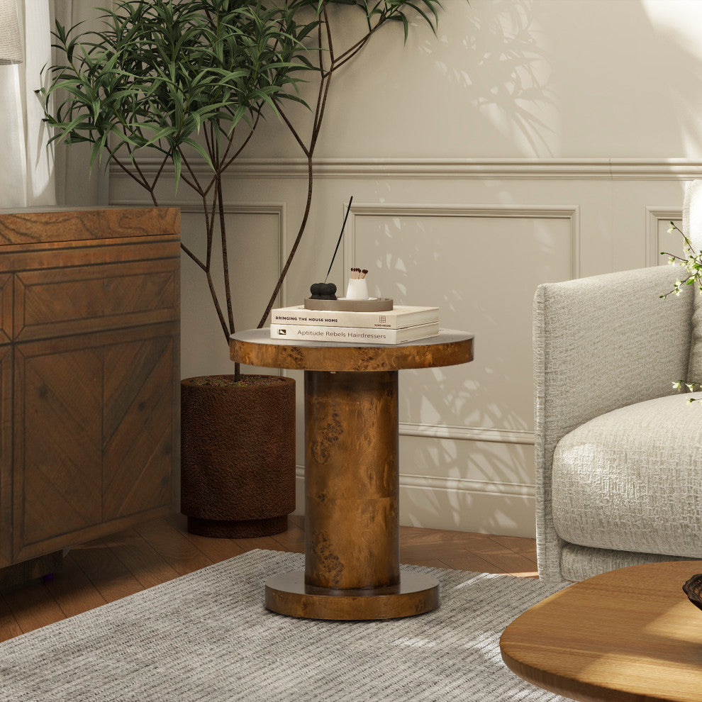 The Bolin Accent Table Collection by Jennifer Taylor Home is a statement piece that radiates natural elegance. Its stunning burl wood veneer showcases unique patterns that make every table one of a kind. The pillar-style base brings a sculptural quality to the design, balancing form and function effortlessly. Compact and versatile, this side table fits seamlessly into modern, contemporary, or transitional interiors. Whether as a stand-alone accent or paired with other furniture, the Bolin table elevates any room with sophistication.Features:- Unique burl wood veneer creates a luxurious and natural aesthetic- Compact 18" size makes it ideal for smaller spaces or as a secondary table- Pillar base design adds stability and a bold, sculptural look- Smooth, round tabletop offers space for lamps, books, or decorative accents- Perfect for living rooms, bedrooms, or entryways to enhance your décor- Timeless design complements both minimalist and maximalist interior styles- Modern & Contemporary, Mid-Century Modern, Art Deco stylesSpecifications:- Dimensions: 18"W X 18"D X 20.5"H- Weight: 18LBS- Weight Capacity: 300 LBS- Number of Shipping Boxes: 1- No assembly required- Care Instructions: Wipe clean with a soft cloth• Burl wood is a distinctive natural material that varies greatly in patterning and coloration and is a part of the unique charm of the original wood - variations throughout the wood may be expected and treasured as a part of each unique piece
