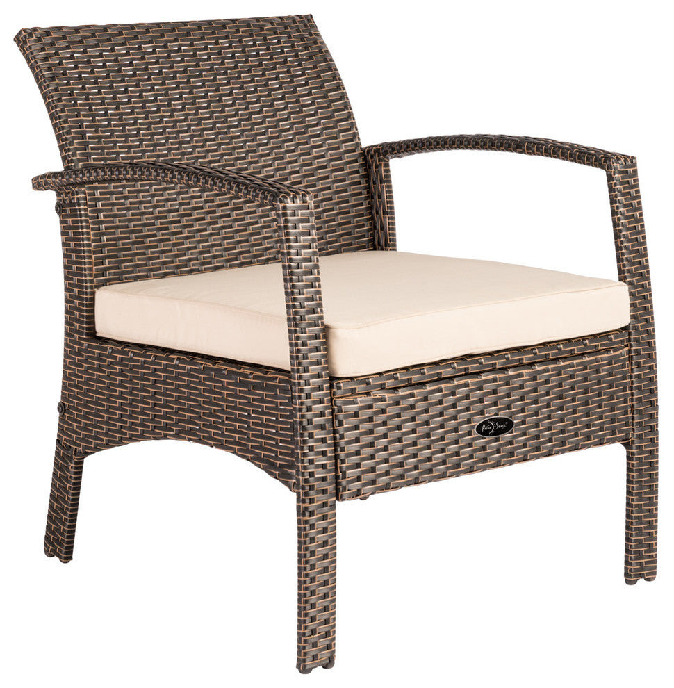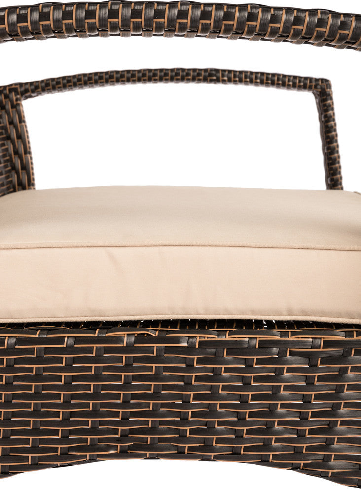 The Bondi Wicker Outdoor Armchair is constructed of all-weather wicker and includes a comfortable khaki cushion. This lightweight yet durable armchair is perfect for enjoying an evening on the patio or relaxing poolside. The attractive mocha finish is the ideal accent for any patio. This wicker chair can be used all year round and provides a low-maintenance outdoor seating experience.Features: All weather wicker construction Beautiful mocha finish Khaki outdoor cushion included Low maintenance - just wipe with a damp cloth or gently launder cushion covers Easy assembly Lightweight for ease of mobility Weight limit is 350 lbsAssembled Dimensions: Chair: 26"L x 28"W x 29"H, Weight; 16 lbs Carton Dimensions: 26"L x 26"W x 8"H, Weight; 19 lbs