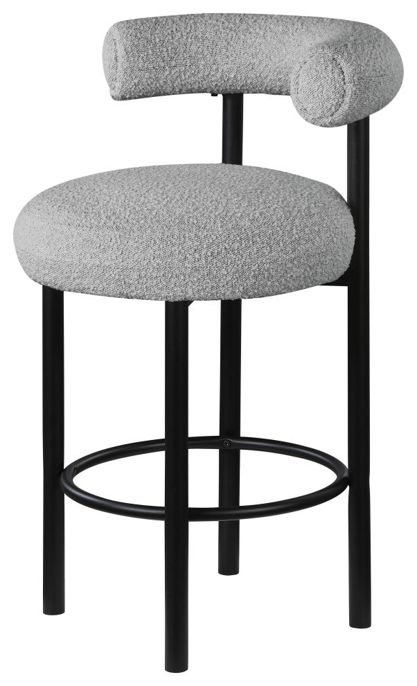Give your kitchen counter or home bar a fresh face with this Bordeaux boucle fabric stool. This stool features rich grey boucle fabric upholstery on the curved back and seat, so guests sit comfortably for pancake breakfasts or their favorite spirits. The iron metal frame is durable, tough, and sturdy, so it holds up to long-term enjoyment by family and friends. A matte black finish lends the stool an uber modern feel.Overall Product Dimensions: 23" W x 22" D x 35.5" HRich Grey Boucle FabricMatte Black FinishIron Metal FrameContemporary DesignSeat Dimensions: Seat Width: 19"Seat Height: 26.5"Seat Depth: 16.5"Back Height: 9"