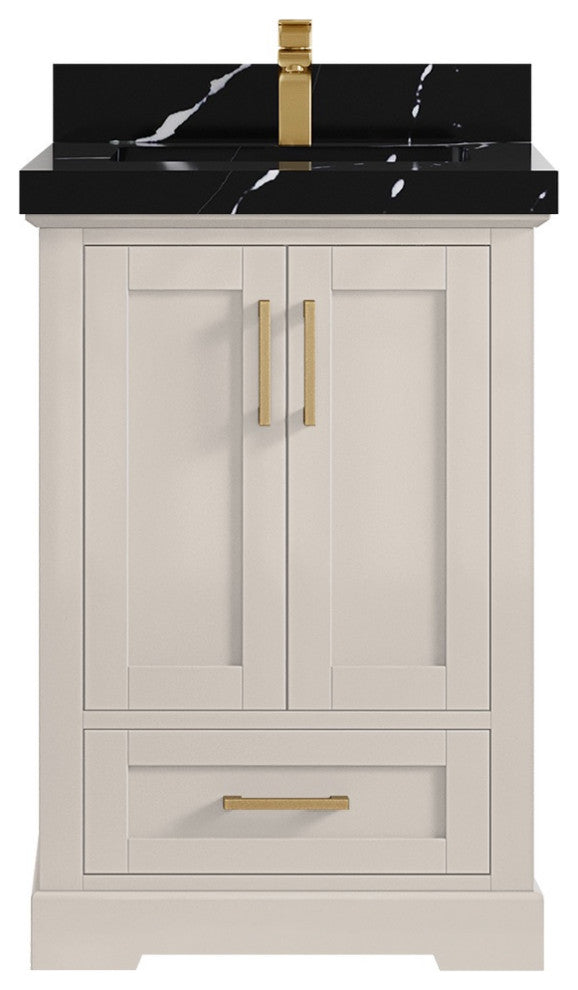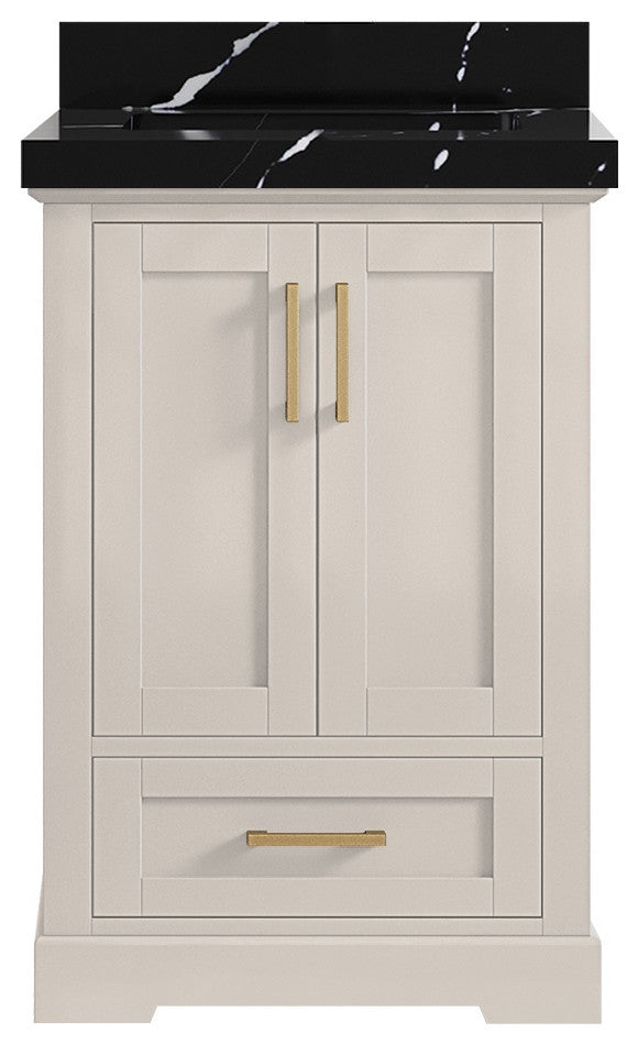 Willow Collection Boston 24 x22 Single Sink Bath Vanity in Fine Grain with 2" Straight/ Mitered Edge Calacatta Black QuartzThe Boston collection features a traditional design bathroom vanity that is both stylish and functional. The vanity is available in Navy Blue, White, Gray and Green colors, and it features soft-close doors and drawers for a smooth, quiet operation. The solid wood frame construction ensures durability, while the dovetail joint adds a touch of craftsmanship. The Boston collection is an excellent choice for any bathroom. This Boston vanity features a handy power plug and hairdryer holder that is available in sizes starting from 42 up to 84 in. The power plug features two USB ports, so you can charge your phones or use them to operate your hairdryer. The hairdryer holder is specially designed to fit most standard hairdryers. With its stylish design and practical features, this vanity is a great addition to any bathroom.Details:Material: Birch Wood and Plywood (NO MDF or PRESSBOARD)Finish Available: Elephant Skin Gray, Evergreen, Navy Blue, White, Pewter Green, Fine Grain and AlabasterNumber of Drawers: 1 Tip Out Drawer, 1 ShelfSink Installation: Under-mounted rectangle SINK(S)Hardware: Soft closing hinges and slider Hardware Finish : Brushed NickelCabinet Width: 23 (in.)Cabinet Depth: 21-1/2 (in.)Countertop Width: 24 (in.) Countertop Depth: 22 (in.)Cabinet Height: 34 (in.)Countertop Height: 1.5 (in.) Double Cove Edge or 2 (in.) Straight/ Mitered EdgeCabinet Height with Top: 36 (in.)Backsplash Height: 4 (in.)Faucet: NOT IncludedFaucet Hole(S): Comes with SINGLE hole faucetVanity Countertops options: Mitered /Straight edge or Double Cove Edge (White Quartz, Calacatta Laza Quartz, Calacatta Nuvo Quartz, Carrara Quartz, Empira Quartz, Carrara Marble, Piatra Gray Quartz, Pearl Light Gray Quartz, Venatino Quartz, Calacatta Gold Quartz, Calacatta Black Quartz)