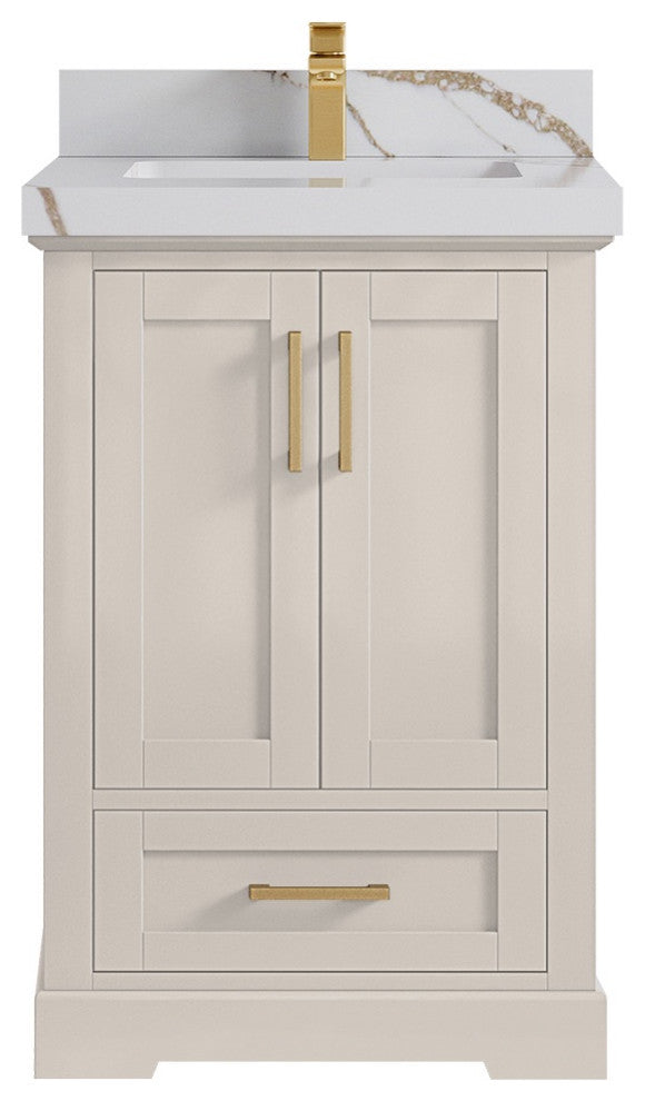 Willow Collection Boston 24 x22 Single Sink Bath Vanity in Fine Grain with 2" Straight/ Mitered Edge Calacatta Gold QuartzThe Boston collection features a traditional design bathroom vanity that is both stylish and functional. The vanity is available in Navy Blue, White, Gray and Green colors, and it features soft-close doors and drawers for a smooth, quiet operation. The solid wood frame construction ensures durability, while the dovetail joint adds a touch of craftsmanship. The Boston collection is an excellent choice for any bathroom. This Boston vanity features a handy power plug and hairdryer holder that is available in sizes starting from 42 up to 84 in. The power plug features two USB ports, so you can charge your phones or use them to operate your hairdryer. The hairdryer holder is specially designed to fit most standard hairdryers. With its stylish design and practical features, this vanity is a great addition to any bathroom.Details:Material: Birch Wood and Plywood (NO MDF or PRESSBOARD)Finish Available: Elephant Skin Gray, Evergreen, Navy Blue, White, Pewter Green, Fine Grain and AlabasterNumber of Drawers: 1 Tip Out Drawer, 1 ShelfSink Installation: Under-mounted rectangle SINK(S)Hardware: Soft closing hinges and slider Hardware Finish : Brushed NickelCabinet Width: 23 (in.)Cabinet Depth: 21-1/2 (in.)Countertop Width: 24 (in.) Countertop Depth: 22 (in.)Cabinet Height: 34 (in.)Countertop Height: 1.5 (in.) Double Cove Edge or 2 (in.) Straight/ Mitered EdgeCabinet Height with Top: 36 (in.)Backsplash Height: 4 (in.)Faucet: NOT IncludedFaucet Hole(S): Comes with SINGLE hole faucetVanity Countertops options: Mitered /Straight edge or Double Cove Edge (White Quartz, Calacatta Laza Quartz, Calacatta Nuvo Quartz, Carrara Quartz, Empira Quartz, Carrara Marble, Piatra Gray Quartz, Pearl Light Gray Quartz, Venatino Quartz, Calacatta Gold Quartz, Calacatta Black Quartz)