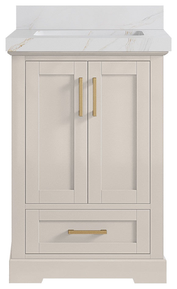 Willow Collection Boston 24 x22 Single Sink Bath Vanity in Fine Grain with 2" Straight/ Mitered Edge Calacatta Sienna QuartzThe Boston collection features a traditional design bathroom vanity that is both stylish and functional. The vanity is available in Navy Blue, White, Gray and Green colors, and it features soft-close doors and drawers for a smooth, quiet operation. The solid wood frame construction ensures durability, while the dovetail joint adds a touch of craftsmanship. The Boston collection is an excellent choice for any bathroom. This Boston vanity features a handy power plug and hairdryer holder that is available in sizes starting from 42 up to 84 in. The power plug features two USB ports, so you can charge your phones or use them to operate your hairdryer. The hairdryer holder is specially designed to fit most standard hairdryers. With its stylish design and practical features, this vanity is a great addition to any bathroom.Details:Material: Birch Wood and Plywood (NO MDF or PRESSBOARD)Finish Available: Elephant Skin Gray, Evergreen, Navy Blue, White, Pewter Green, Fine Grain and AlabasterNumber of Drawers: 1 Tip Out Drawer, 1 ShelfSink Installation: Under-mounted rectangle SINK(S)Hardware: Soft closing hinges and slider Hardware Finish : Brushed NickelCabinet Width: 23 (in.)Cabinet Depth: 21-1/2 (in.)Countertop Width: 24 (in.) Countertop Depth: 22 (in.)Cabinet Height: 34 (in.)Countertop Height: 1.5 (in.) Double Cove Edge or 2 (in.) Straight/ Mitered EdgeCabinet Height with Top: 36 (in.)Backsplash Height: 4 (in.)Faucet: NOT IncludedFaucet Hole(S): Comes with SINGLE hole faucetVanity Countertops options: Mitered /Straight edge or Double Cove Edge (White Quartz, Calacatta Laza Quartz, Calacatta Nuvo Quartz, Carrara Quartz, Empira Quartz, Carrara Marble, Piatra Gray Quartz, Pearl Light Gray Quartz, Venatino Quartz, Calacatta Gold Quartz, Calacatta Black Quartz)
