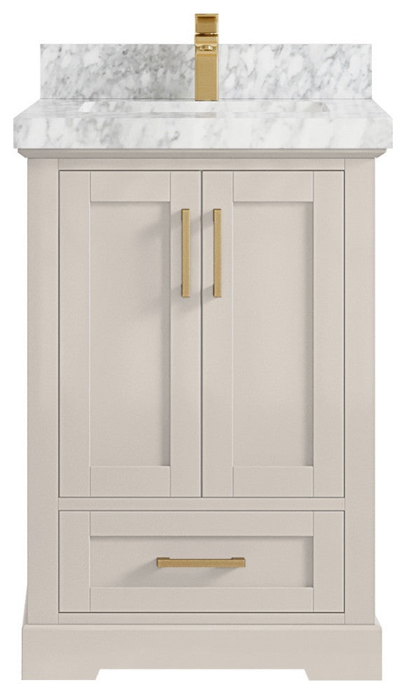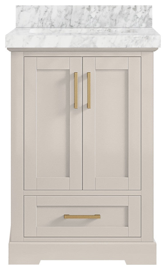 Willow Collection Boston 24 x22 Single Sink Bath Vanity in Fine Grain with 2" Straight/ Mitered Edge Carrara Marble The Boston collection features a traditional design bathroom vanity that is both stylish and functional. The vanity is available in Navy Blue, White, Gray and Green colors, and it features soft-close doors and drawers for a smooth, quiet operation. The solid wood frame construction ensures durability, while the dovetail joint adds a touch of craftsmanship. The Boston collection is an excellent choice for any bathroom. This Boston vanity features a handy power plug and hairdryer holder that is available in sizes starting from 42 up to 84 in. The power plug features two USB ports, so you can charge your phones or use them to operate your hairdryer. The hairdryer holder is specially designed to fit most standard hairdryers. With its stylish design and practical features, this vanity is a great addition to any bathroom.Details:Material: Birch Wood and Plywood (NO MDF or PRESSBOARD)Finish Available: Elephant Skin Gray, Evergreen, Navy Blue, White, Pewter Green, Fine Grain and AlabasterNumber of Drawers: 1 Tip Out Drawer, 1 ShelfSink Installation: Under-mounted rectangle SINK(S)Hardware: Soft closing hinges and slider Hardware Finish : Brushed NickelCabinet Width: 23 (in.)Cabinet Depth: 21-1/2 (in.)Countertop Width: 24 (in.) Countertop Depth: 22 (in.)Cabinet Height: 34 (in.)Countertop Height: 1.5 (in.) Double Cove Edge or 2 (in.) Straight/ Mitered EdgeCabinet Height with Top: 36 (in.)Backsplash Height: 4 (in.)Faucet: NOT IncludedFaucet Hole(S): Comes with SINGLE hole faucetVanity Countertops options: Mitered /Straight edge or Double Cove Edge (White Quartz, Calacatta Laza Quartz, Calacatta Nuvo Quartz, Carrara Quartz, Empira Quartz, Carrara Marble, Piatra Gray Quartz, Pearl Light Gray Quartz, Venatino Quartz, Calacatta Gold Quartz, Calacatta Black Quartz)