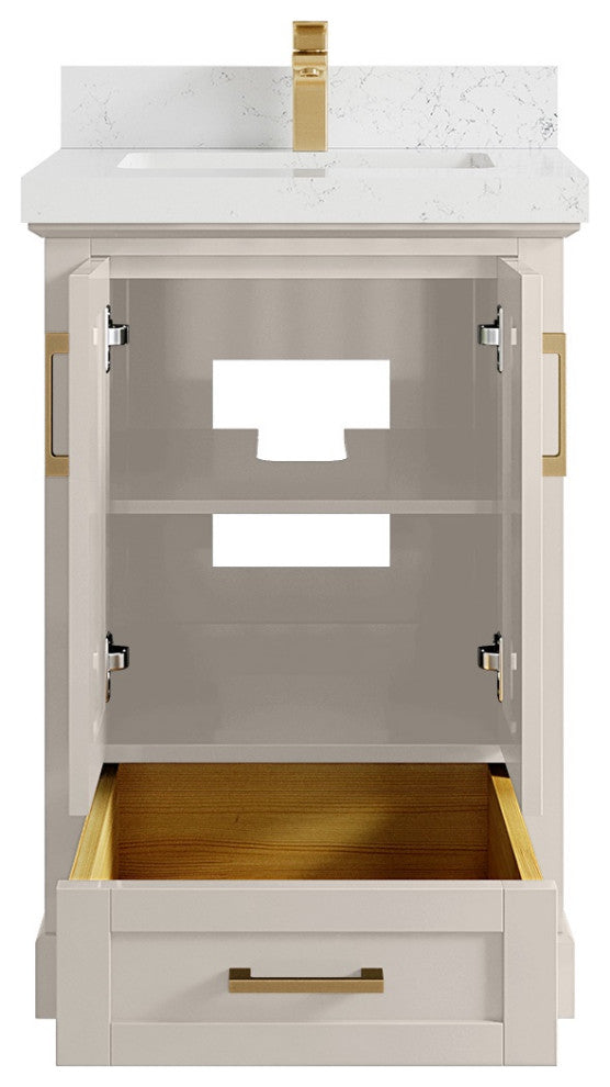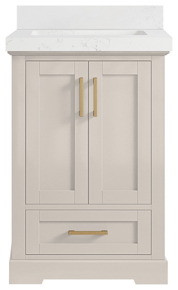 Willow Collection Boston 24 x22 Single Sink Bath Vanity in Fine Grain with 2" Straight/ Mitered Edge Empira QuartzThe Boston collection features a traditional design bathroom vanity that is both stylish and functional. The vanity is available in Navy Blue, White, Gray and Green colors, and it features soft-close doors and drawers for a smooth, quiet operation. The solid wood frame construction ensures durability, while the dovetail joint adds a touch of craftsmanship. The Boston collection is an excellent choice for any bathroom. This Boston vanity features a handy power plug and hairdryer holder that is available in sizes starting from 42 up to 84 in. The power plug features two USB ports, so you can charge your phones or use them to operate your hairdryer. The hairdryer holder is specially designed to fit most standard hairdryers. With its stylish design and practical features, this vanity is a great addition to any bathroom.Details:Material: Birch Wood and Plywood (NO MDF or PRESSBOARD)Finish Available: Elephant Skin Gray, Evergreen, Navy Blue, White, Pewter Green, Fine Grain and AlabasterNumber of Drawers: 1 Tip Out Drawer, 1 ShelfSink Installation: Under-mounted rectangle SINK(S)Hardware: Soft closing hinges and slider Hardware Finish : Brushed NickelCabinet Width: 23 (in.)Cabinet Depth: 21-1/2 (in.)Countertop Width: 24 (in.) Countertop Depth: 22 (in.)Cabinet Height: 34 (in.)Countertop Height: 1.5 (in.) Double Cove Edge or 2 (in.) Straight/ Mitered EdgeCabinet Height with Top: 36 (in.)Backsplash Height: 4 (in.)Faucet: NOT IncludedFaucet Hole(S): Comes with SINGLE hole faucetVanity Countertops options: Mitered /Straight edge or Double Cove Edge (White Quartz, Calacatta Laza Quartz, Calacatta Nuvo Quartz, Carrara Quartz, Empira Quartz, Carrara Marble, Piatra Gray Quartz, Pearl Light Gray Quartz, Venatino Quartz, Calacatta Gold Quartz, Calacatta Black Quartz)