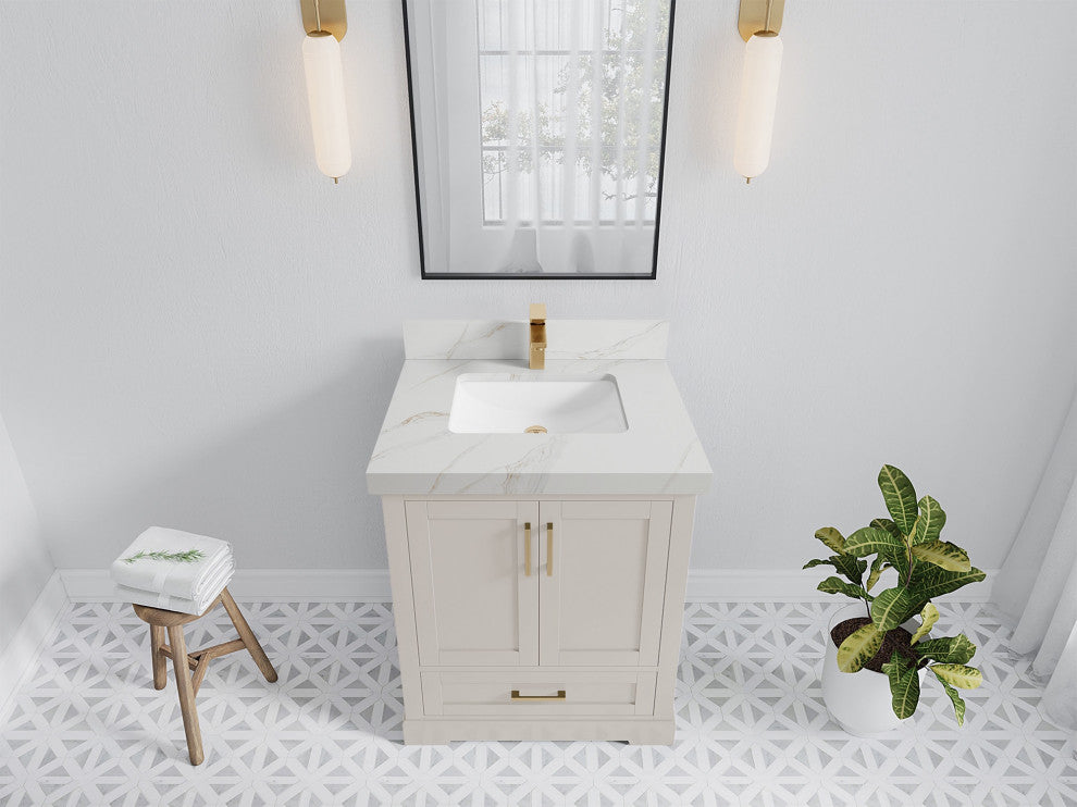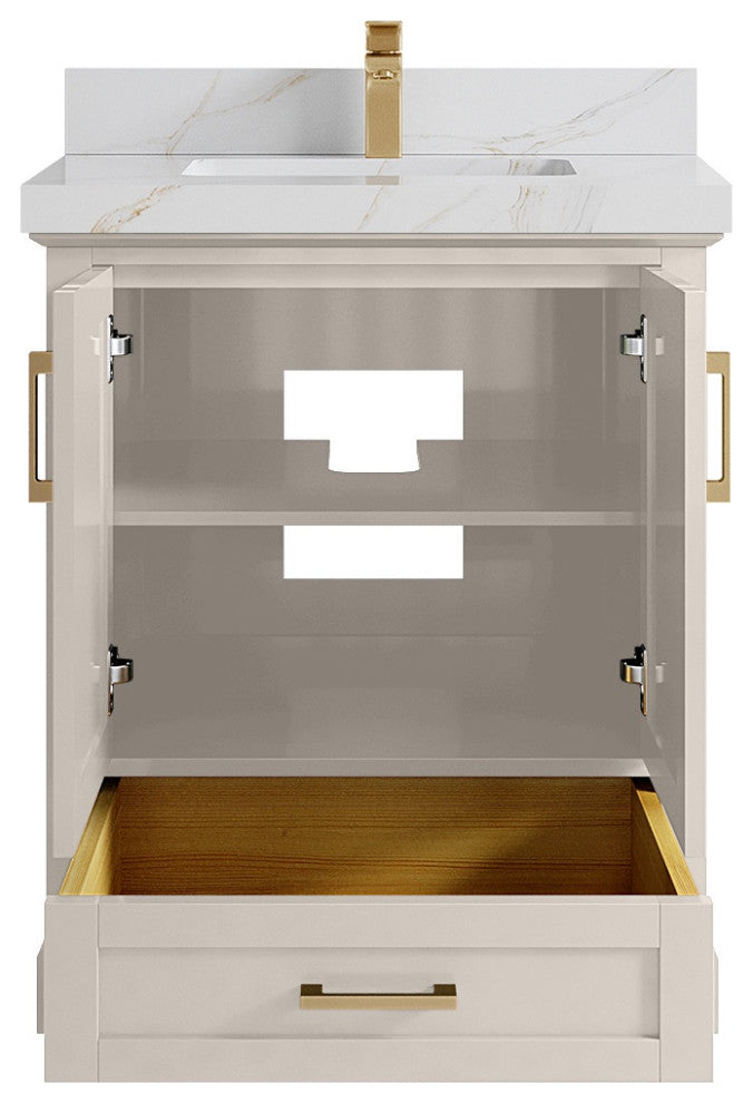 Willow Collection Boston 30 x 22 Single Sink Bath Vanity in Fine Grain with 2" Straight/ Mitered Edge Calacatta Sienna QuartzThe Boston collection features a traditional design bathroom vanity that is both stylish and functional. The vanity is available in Navy Blue, White, Gray and Green colors, and it features soft-close doors and drawers for a smooth, quiet operation. The solid wood frame construction ensures durability, while the dovetail joint adds a touch of craftsmanship. The Boston collection is an excellent choice for any bathroom. This Boston vanity features a handy power plug and hairdryer holder that is available in sizes starting from 42 up to 84 in. The power plug features two USB ports, so you can charge your phones or use them to operate your hairdryer. The hairdryer holder is specially designed to fit most standard hairdryers. With its stylish design and practical features, this vanity is a great addition to any bathroom.Details:Material: Birch Wood and Plywood (NO MDF or PRESSBOARD)Finish Available: Elephant Skin Gray, Evergreen, Navy Blue, White, Pewter Green, Fine Grain and AlabasterNumber of Drawers: 1 Tip Out Drawer, 1 ShelfSink Installation: Under-mounted rectangle SINK(S)Hardware: Soft closing hinges and slider Hardware Finish : Brushed NickelCabinet Width: 29 (in.)Cabinet Depth: 21-1/2 (in.)Countertop Width: 30 (in.) Countertop Depth: 22 (in.)Cabinet Height: 34 (in.)Countertop Height: 1.5 (in.) Double Cove Edge or 2 (in.) Straight/ Mitered EdgeCabinet Height with Top: 36 (in.)Backsplash Height: 4 (in.)Faucet: NOT IncludedFaucet Hole(S): Comes with SINGLE hole faucetVanity Countertops options: Mitered /Straight edge or Double Cove Edge (White Quartz, Calacatta Laza Quartz, Calacatta Nuvo Quartz, Carrara Quartz, Empira Quartz, Carrara Marble, Piatra Gray Quartz, Pearl Light Gray Quartz, Venatino Quartz, Calacatta Gold Quartz, Calacatta Black Quartz)