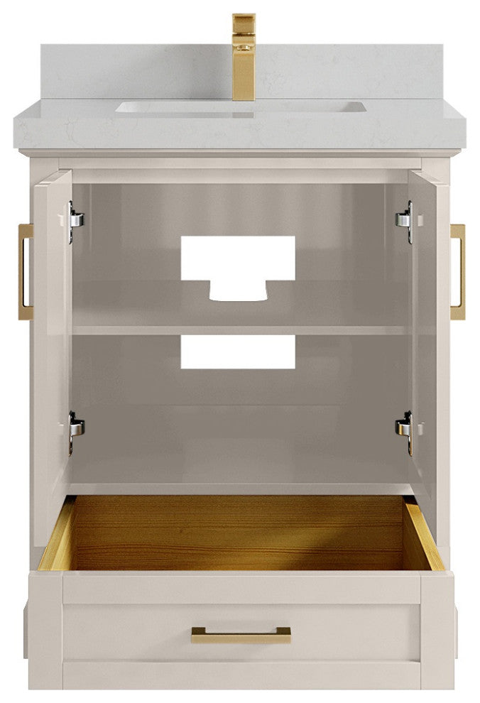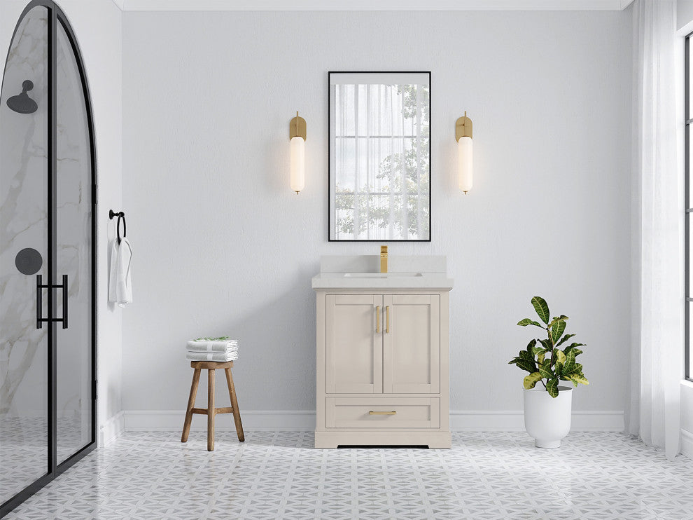 Willow Collection Boston 30 x 22 Single Sink Bath Vanity in Fine Grain with 2" Straight/ Mitered Edge Carrara QuartzThe Boston collection features a traditional design bathroom vanity that is both stylish and functional. The vanity is available in Navy Blue, White, Gray and Green colors, and it features soft-close doors and drawers for a smooth, quiet operation. The solid wood frame construction ensures durability, while the dovetail joint adds a touch of craftsmanship. The Boston collection is an excellent choice for any bathroom. This Boston vanity features a handy power plug and hairdryer holder that is available in sizes starting from 42 up to 84 in. The power plug features two USB ports, so you can charge your phones or use them to operate your hairdryer. The hairdryer holder is specially designed to fit most standard hairdryers. With its stylish design and practical features, this vanity is a great addition to any bathroom.Details:Material: Birch Wood and Plywood (NO MDF or PRESSBOARD)Finish Available: Elephant Skin Gray, Evergreen, Navy Blue, White, Pewter Green, Fine Grain and AlabasterNumber of Drawers: 1 Tip Out Drawer, 1 ShelfSink Installation: Under-mounted rectangle SINK(S)Hardware: Soft closing hinges and slider Hardware Finish : Brushed NickelCabinet Width: 29 (in.)Cabinet Depth: 21-1/2 (in.)Countertop Width: 30 (in.) Countertop Depth: 22 (in.)Cabinet Height: 34 (in.)Countertop Height: 1.5 (in.) Double Cove Edge or 2 (in.) Straight/ Mitered EdgeCabinet Height with Top: 36 (in.)Backsplash Height: 4 (in.)Faucet: NOT IncludedFaucet Hole(S): Comes with SINGLE hole faucetVanity Countertops options: Mitered /Straight edge or Double Cove Edge (White Quartz, Calacatta Laza Quartz, Calacatta Nuvo Quartz, Carrara Quartz, Empira Quartz, Carrara Marble, Piatra Gray Quartz, Pearl Light Gray Quartz, Venatino Quartz, Calacatta Gold Quartz, Calacatta Black Quartz)