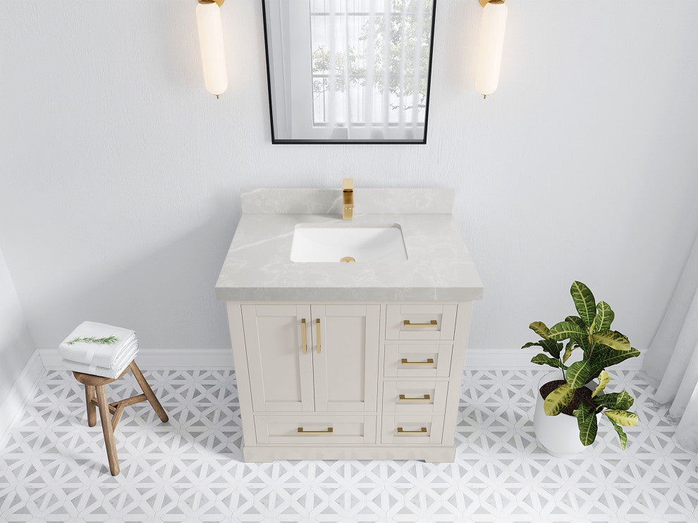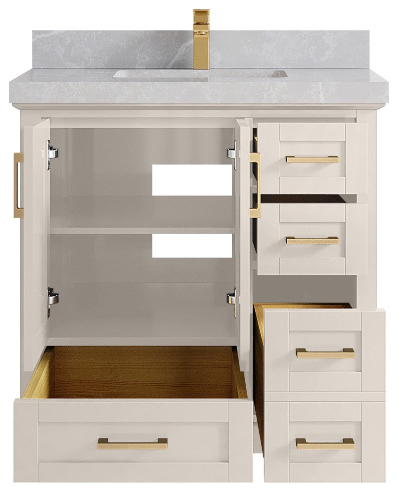 Willow Collection Boston 36 x 22 Center Single Sink with Left Side Bath Vanity in Fine Grain with 2" Straight/ Mitered Edge Pearl Light Gray QuartzThe Boston collection features a traditional design bathroom vanity that is both stylish and functional. The vanity is available in Navy Blue, White, Gray and Green colors, and it features soft-close doors and drawers for a smooth, quiet operation. The solid wood frame construction ensures durability, while the dovetail joint adds a touch of craftsmanship. The Boston collection is an excellent choice for any bathroom. This Boston vanity features a handy power plug and hairdryer holder that is available in sizes starting from 42 up to 84 in. The power plug features two USB ports, so you can charge your phones or use them to operate your hairdryer. The hairdryer holder is specially designed to fit most standard hairdryers. With its stylish design and practical features, this vanity is a great addition to any bathroom.Details:Material: Birch Wood and Plywood (NO MDF or PRESSBOARD)Finish Available: Elephant Skin Gray, Evergreen, Navy Blue, White, Pewter Green, Fine Grain and AlabasterNumber of Drawers: 3 Regular Drawers, 1 DOUBLE DRAWER WITH POWER PLUG AND ACCESSORIES (DEEP), 1 ShelfSink Installation: Under-mounted rectangle SINK(S)Hardware: Soft closing hinges and sliderHardware Finish : Brushed NickelCabinet Width: 35 (in.)Cabinet Depth: 21-1/2 (in.)Countertop Width: 36 (in.) Countertop Depth: 22 (in.)Cabinet Height: 34 (in.)Countertop Height: 1.5 (in.) Double Cove Edge or 2 (in.) Straight/ Mitered EdgeCabinet Height with Top: 36 (in.)Backsplash Height: 4 (in.)Faucet: NOT IncludedFaucet Hole(S): Comes with SINGLE hole faucetVanity Countertops options: Mitered /Straight edge or Double Cove Edge (White Quartz, Calacatta Laza Quartz, Calacatta Nuvo Quartz, Carrara Quartz, Empira Quartz, Carrara Marble, Piatra Gray Quartz, Pearl Light Gray Quartz, Venatino Quartz, Calacatta Gold Quartz, Calacatta Black Quartz)