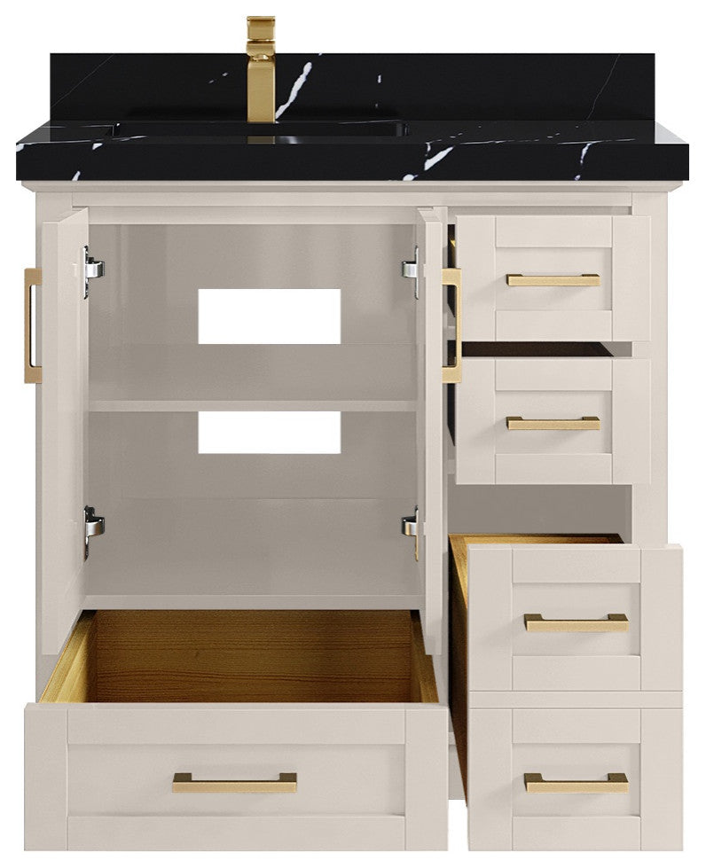 Willow Collection Boston 36 x 22 Left Offset Single Sink Bath Vanity in Fine Grain with 2" Straight/ Mitered Edge Calacatta Black Quartz The Boston collection features a traditional design bathroom vanity that is both stylish and functional. The vanity is available in Navy Blue, White, Gray and Green colors, and it features soft-close doors and drawers for a smooth, quiet operation. The solid wood frame construction ensures durability, while the dovetail joint adds a touch of craftsmanship. The Boston collection is an excellent choice for any bathroom. This Boston vanity features a handy power plug and hairdryer holder that is available in sizes starting from 42 up to 84 in. The power plug features two USB ports, so you can charge your phones or use them to operate your hairdryer. The hairdryer holder is specially designed to fit most standard hairdryers. With its stylish design and practical features, this vanity is a great addition to any bathroom.Details:Material: Birch Wood and Plywood (NO MDF or PRESSBOARD)Finish Available: Elephant Skin Gray, Evergreen, Navy Blue, White, Pewter Green, Fine Grain and AlabasterNumber of Drawers: 3 Regular Drawers, 1 DOUBLE DRAWER WITH POWER PLUG AND ACCESSORIES (DEEP), 1 ShelfSink Installation: Under-mounted rectangle SINK(S)Hardware: Soft closing hinges and sliderHardware Finish : Brushed NickelCabinet Width: 35 (in.)Cabinet Depth: 21-1/2 (in.)Countertop Width: 36 (in.) Countertop Depth: 22 (in.)Cabinet Height: 34 (in.)Countertop Height: 1.5 (in.) Double Cove Edge or 2 (in.) Straight/ Mitered EdgeCabinet Height with Top: 36 (in.)Backsplash Height: 4 (in.)Faucet: NOT IncludedFaucet Hole(S): Comes with SINGLE hole faucetVanity Countertops options: Mitered /Straight edge or Double Cove Edge (White Quartz, Calacatta Laza Quartz, Calacatta Nuvo Quartz, Carrara Quartz, Empira Quartz, Carrara Marble, Piatra Gray Quartz, Pearl Light Gray Quartz, Venatino Quartz, Calacatta Gold Quartz, Calacatta Black Quartz)