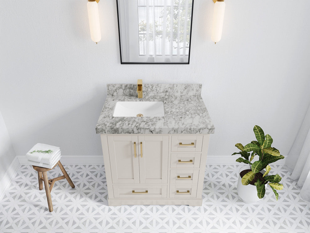 Willow Collection Boston 36 x 22 Left Offset Single Sink Bath Vanity in Fine Grain with 2" Straight/ Mitered Edge Carrara Marble The Boston collection features a traditional design bathroom vanity that is both stylish and functional. The vanity is available in Navy Blue, White, Gray and Green colors, and it features soft-close doors and drawers for a smooth, quiet operation. The solid wood frame construction ensures durability, while the dovetail joint adds a touch of craftsmanship. The Boston collection is an excellent choice for any bathroom. This Boston vanity features a handy power plug and hairdryer holder that is available in sizes starting from 42 up to 84 in. The power plug features two USB ports, so you can charge your phones or use them to operate your hairdryer. The hairdryer holder is specially designed to fit most standard hairdryers. With its stylish design and practical features, this vanity is a great addition to any bathroom.Details:Material: Birch Wood and Plywood (NO MDF or PRESSBOARD)Finish Available: Elephant Skin Gray, Evergreen, Navy Blue, White, Pewter Green, Fine Grain and AlabasterNumber of Drawers: 3 Regular Drawers, 1 DOUBLE DRAWER WITH POWER PLUG AND ACCESSORIES (DEEP), 1 ShelfSink Installation: Under-mounted rectangle SINK(S)Hardware: Soft closing hinges and sliderHardware Finish : Brushed NickelCabinet Width: 35 (in.)Cabinet Depth: 21-1/2 (in.)Countertop Width: 36 (in.) Countertop Depth: 22 (in.)Cabinet Height: 34 (in.)Countertop Height: 1.5 (in.) Double Cove Edge or 2 (in.) Straight/ Mitered EdgeCabinet Height with Top: 36 (in.)Backsplash Height: 4 (in.)Faucet: NOT IncludedFaucet Hole(S): Comes with SINGLE hole faucetVanity Countertops options: Mitered /Straight edge or Double Cove Edge (White Quartz, Calacatta Laza Quartz, Calacatta Nuvo Quartz, Carrara Quartz, Empira Quartz, Carrara Marble, Piatra Gray Quartz, Pearl Light Gray Quartz, Venatino Quartz, Calacatta Gold Quartz, Calacatta Black Quartz)
