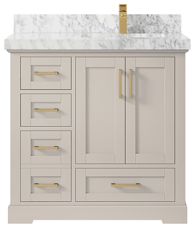 Willow Collection Boston 36 x 22 Right Offset Single Sink Bath Vanity in Fine Grain with 2" Straight/ Mitered Edge Carrara Marble The Boston collection features a traditional design bathroom vanity that is both stylish and functional. The vanity is available in Navy Blue, White, Gray and Green colors, and it features soft-close doors and drawers for a smooth, quiet operation. The solid wood frame construction ensures durability, while the dovetail joint adds a touch of craftsmanship. The Boston collection is an excellent choice for any bathroom. This Boston vanity features a handy power plug and hairdryer holder that is available in sizes starting from 42 up to 84 in. The power plug features two USB ports, so you can charge your phones or use them to operate your hairdryer. The hairdryer holder is specially designed to fit most standard hairdryers. With its stylish design and practical features, this vanity is a great addition to any bathroom.Details:Material: Birch Wood and Plywood (NO MDF or PRESSBOARD)Finish Available: Elephant Skin Gray, Evergreen, Navy Blue, White, Pewter Green, Fine Grain and AlabasterNumber of Drawers: 3 Regular Drawers, 1 DOUBLE DRAWER WITH POWER PLUG AND ACCESSORIES (DEEP), 1 ShelfSink Installation: Under-mounted rectangle SINK(S)Hardware: Soft closing hinges and sliderHardware Finish : Brushed NickelCabinet Width: 35 (in.)Cabinet Depth: 21-1/2 (in.)Countertop Width: 36 (in.) Countertop Depth: 22 (in.)Cabinet Height: 34 (in.)Countertop Height: 1.5 (in.) Double Cove Edge or 2 (in.) Straight/ Mitered EdgeCabinet Height with Top: 36 (in.)Backsplash Height: 4 (in.)Faucet: NOT IncludedFaucet Hole(S): Comes with SINGLE hole faucetVanity Countertops options: Mitered /Straight edge or Double Cove Edge (White Quartz, Calacatta Laza Quartz, Calacatta Nuvo Quartz, Carrara Quartz, Empira Quartz, Carrara Marble, Piatra Gray Quartz, Pearl Light Gray Quartz, Venatino Quartz, Calacatta Gold Quartz, Calacatta Black Quartz)