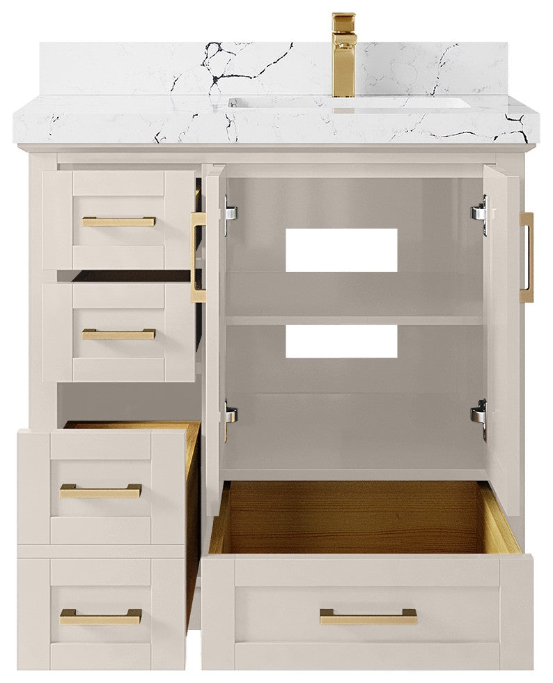 Willow Collection Boston 36 x 22 Right Offset Single Sink Bath Vanity in Fine Grain with 2" Straight/ Mitered Edge Viola Night Quartz The Boston collection features a traditional design bathroom vanity that is both stylish and functional. The vanity is available in Navy Blue, White, Gray and Green colors, and it features soft-close doors and drawers for a smooth, quiet operation. The solid wood frame construction ensures durability, while the dovetail joint adds a touch of craftsmanship. The Boston collection is an excellent choice for any bathroom. This Boston vanity features a handy power plug and hairdryer holder that is available in sizes starting from 42 up to 84 in. The power plug features two USB ports, so you can charge your phones or use them to operate your hairdryer. The hairdryer holder is specially designed to fit most standard hairdryers. With its stylish design and practical features, this vanity is a great addition to any bathroom.Details:Material: Birch Wood and Plywood (NO MDF or PRESSBOARD)Finish Available: Elephant Skin Gray, Evergreen, Navy Blue, White, Pewter Green, Fine Grain and AlabasterNumber of Drawers: 3 Regular Drawers, 1 DOUBLE DRAWER WITH POWER PLUG AND ACCESSORIES (DEEP), 1 ShelfSink Installation: Under-mounted rectangle SINK(S)Hardware: Soft closing hinges and sliderHardware Finish : Brushed NickelCabinet Width: 35 (in.)Cabinet Depth: 21-1/2 (in.)Countertop Width: 36 (in.) Countertop Depth: 22 (in.)Cabinet Height: 34 (in.)Countertop Height: 1.5 (in.) Double Cove Edge or 2 (in.) Straight/ Mitered EdgeCabinet Height with Top: 36 (in.)Backsplash Height: 4 (in.)Faucet: NOT IncludedFaucet Hole(S): Comes with SINGLE hole faucetVanity Countertops options: Mitered /Straight edge or Double Cove Edge (White Quartz, Calacatta Laza Quartz, Calacatta Nuvo Quartz, Carrara Quartz, Empira Quartz, Carrara Marble, Piatra Gray Quartz, Pearl Light Gray Quartz, Venatino Quartz, Calacatta Gold Quartz, Calacatta Black Quartz)