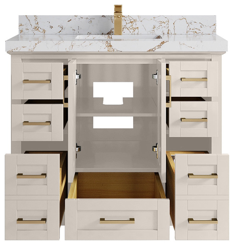 Willow Collection Boston 42 x 22 Single Sink Bath Vanity in Fine Grain with 2" Straight/ Mitered Edge Viola Gold Quartz The Boston collection features a traditional design bathroom vanity that is both stylish and functional. The vanity is available in Navy Blue, White, Gray and Green colors, and it features soft-close doors and drawers for a smooth, quiet operation. The solid wood frame construction ensures durability, while the dovetail joint adds a touch of craftsmanship. The Boston collection is an excellent choice for any bathroom. This Boston vanity features a handy power plug and hairdryer holder that is available in sizes starting from 42 up to 84 in. The power plug features two USB ports, so you can charge your phones or use them to operate your hairdryer. The hairdryer holder is specially designed to fit most standard hairdryers. With its stylish design and practical features, this vanity is a great addition to any bathroom.Details:Material: Birch Wood and Plywood (NO MDF or PRESSBOARD) Finish Available: Elephant Skin Gray, Evergreen, Navy Blue, White, Pewter Green, Fine Grain and AlabasterNumber of Drawers: 5 Regular Drawers, 1 DOUBLE DRAWER WITH POWER PLUG AND ACCESSORIES (DEEP), 1 Regular Double Drawer (Deep), 1 ShelfSink Installation: Under-mounted rectangle SINK(S)Hardware: Soft closing hinges and slider Hardware Finish : Brushed NickelCabinet Width: 41 (in.)Cabinet Depth: 21-1/2 (in.)Countertop Width: 42 (in.) Countertop Depth: 22 (in.)Cabinet Height: 34 (in.)Countertop Height: 1.5 (in.) Double Cove Edge or 2 (in.) Straight/ Mitered EdgeCabinet Height with Top: 36 (in.)Backsplash Height: 4 (in.)Faucet: NOT IncludedFaucet Hole(S): Comes with SINGLE hole faucetVanity Countertops options: Mitered /Straight edge or Double Cove Edge (White Quartz, Calacatta Laza Quartz, Calacatta Nuvo Quartz, Carrara Quartz, Empira Quartz, Carrara Marble, Piatra Gray Quartz, Pearl Light Gray Quartz, Venatino Quartz, Calacatta Gold Quartz, Calacatta Black Quartz)