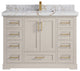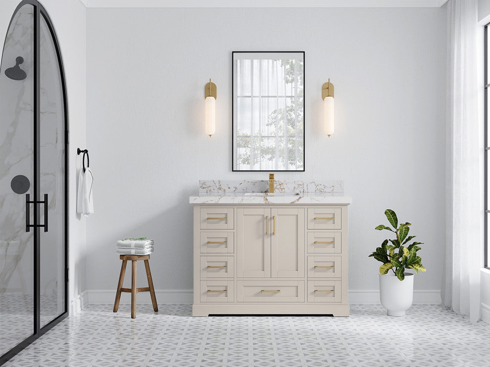 Willow Collection Boston 48 x 22 Single Sink Bath Vanity in Fine Grain with 2" Straight/ Mitered Edge Viola Gold Quartz The Boston collection features a traditional design bathroom vanity that is both stylish and functional. The vanity is available in Navy Blue, White, Gray and Green colors, and it features soft-close doors and drawers for a smooth, quiet operation. The solid wood frame construction ensures durability, while the dovetail joint adds a touch of craftsmanship. The Boston collection is an excellent choice for any bathroom. This Boston vanity features a handy power plug and hairdryer holder that is available in sizes starting from 42 up to 84 in. The power plug features two USB ports, so you can charge your phones or use them to operate your hairdryer. The hairdryer holder is specially designed to fit most standard hairdryers. With its stylish design and practical features, this vanity is a great addition to any bathroom.Details:Material: Birch Wood and Plywood (NO MDF or PRESSBOARD) Finish Available: Elephant Skin Gray, Evergreen, Navy Blue, White, Pewter Green, Fine Grain and AlabasterNumber of Drawers: 5 Regular Drawers, 1 DOUBLE DRAWER WITH POWER PLUG AND ACCESSORIES (DEEP), 1 Regular Double Drawer (Deep), 1 ShelfSink Installation: Under-mounted rectangle SINK(S)Hardware: Soft closing hinges and slider Hardware Finish : Brushed NickelCabinet Width: 47 (in.)Cabinet Depth: 21-1/2 (in.)Countertop Width: 48 (in.) Countertop Depth: 22 (in.)Cabinet Height: 34 (in.)Countertop Height: 1.5 (in.) Double Cove Edge or 2 (in.) Straight/ Mitered EdgeCabinet Height with Top: 36 (in.)Backsplash Height: 4 (in.)Faucet: NOT IncludedFaucet Hole(S): Comes with SINGLE hole faucetVanity Countertops options: Mitered /Straight edge or Double Cove Edge (White Quartz, Calacatta Laza Quartz, Calacatta Nuvo Quartz, Carrara Quartz, Empira Quartz, Carrara Marble, Piatra Gray Quartz, Pearl Light Gray Quartz, Venatino Quartz, Calacatta Gold Quartz, Calacatta Black Quartz)