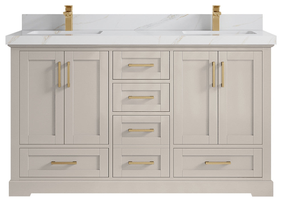 Willow Collection Boston 60 x 22 Double Sink Bath Vanity in Fine Grain with 2" Straight/ Mitered Edge Calacatta Sienna QuartzThe Boston collection features a traditional design bathroom vanity that is both stylish and functional. The vanity is available in Navy Blue, White, Gray and Green colors, and it features soft-close doors and drawers for a smooth, quiet operation. The solid wood frame construction ensures durability, while the dovetail joint adds a touch of craftsmanship. The Boston collection is an excellent choice for any bathroom. This Boston vanity features a handy power plug and hairdryer holder that is available in sizes starting from 42 up to 84 in. The power plug features two USB ports, so you can charge your phones or use them to operate your hairdryer. The hairdryer holder is specially designed to fit most standard hairdryers. With its stylish design and practical features, this vanity is a great addition to any bathroom.Details:Material: Birch Wood and Plywood (NO MDF or PRESSBOARD) Finish Available: Elephant Skin Gray, Evergreen, Navy Blue, White, Pewter Green, Fine Grain and AlabasterNumber of Drawers: 5 Regular Drawers, 1 DOUBLE DRAWER WITH POWER PLUG AND ACCESSORIES ( DEEP), 1 Regular Double Drawer (Deep), 1 ShelfSink Installation: Under-mounted rectangle SINK(S)Hardware: Soft closing hinges and slider Hardware Finish : Brushed NickelCabinet Width: 59 (in.)Cabinet Depth: 21-1/2 (in.)Countertop Width: 60 (in.) Countertop Depth: 22 (in.)Cabinet Height: 34 (in.)Countertop Height: 1.5 (in.) Double Cove Edge or 2 (in.) Straight/ Mitered EdgeCabinet Height with Top: 36 (in.)Backsplash Height: 4 (in.)Faucet: NOT IncludedFaucet Hole(S): Comes with SINGLE hole faucetVanity Countertops options: Mitered /Straight edge or Double Cove Edge (White Quartz, Calacatta Laza Quartz, Calacatta Nuvo Quartz, Carrara Quartz, Empira Quartz, Carrara Marble, Piatra Gray Quartz, Pearl Light Gray Quartz, Venatino Quartz, Calacatta Gold Quartz, Calacatta Black Quartz)