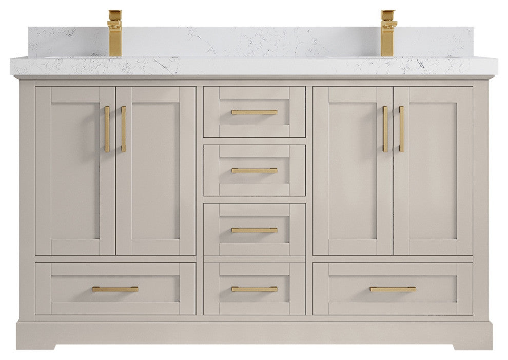 Willow Collection Boston 60 x 22 Double Sink Bath Vanity in Fine Grain with 2" Straight/ Mitered Edge Empira QuartzThe Boston collection features a traditional design bathroom vanity that is both stylish and functional. The vanity is available in Navy Blue, White, Gray and Green colors, and it features soft-close doors and drawers for a smooth, quiet operation. The solid wood frame construction ensures durability, while the dovetail joint adds a touch of craftsmanship. The Boston collection is an excellent choice for any bathroom. This Boston vanity features a handy power plug and hairdryer holder that is available in sizes starting from 42 up to 84 in. The power plug features two USB ports, so you can charge your phones or use them to operate your hairdryer. The hairdryer holder is specially designed to fit most standard hairdryers. With its stylish design and practical features, this vanity is a great addition to any bathroom.Details:Material: Birch Wood and Plywood (NO MDF or PRESSBOARD) Finish Available: Elephant Skin Gray, Evergreen, Navy Blue, White, Pewter Green, Fine Grain and AlabasterNumber of Drawers: 5 Regular Drawers, 1 DOUBLE DRAWER WITH POWER PLUG AND ACCESSORIES ( DEEP), 1 Regular Double Drawer (Deep), 1 ShelfSink Installation: Under-mounted rectangle SINK(S)Hardware: Soft closing hinges and slider Hardware Finish : Brushed NickelCabinet Width: 59 (in.)Cabinet Depth: 21-1/2 (in.)Countertop Width: 60 (in.) Countertop Depth: 22 (in.)Cabinet Height: 34 (in.)Countertop Height: 1.5 (in.) Double Cove Edge or 2 (in.) Straight/ Mitered EdgeCabinet Height with Top: 36 (in.)Backsplash Height: 4 (in.)Faucet: NOT IncludedFaucet Hole(S): Comes with SINGLE hole faucetVanity Countertops options: Mitered /Straight edge or Double Cove Edge (White Quartz, Calacatta Laza Quartz, Calacatta Nuvo Quartz, Carrara Quartz, Empira Quartz, Carrara Marble, Piatra Gray Quartz, Pearl Light Gray Quartz, Venatino Quartz, Calacatta Gold Quartz, Calacatta Black Quartz)