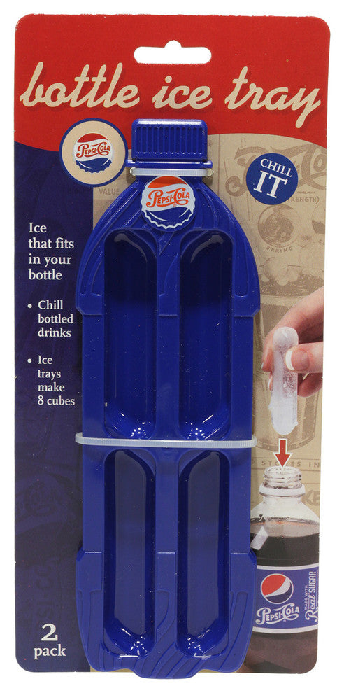 Features the vintage 1950 Pepsi logo, colors and design. With the Pepsi Bottle Ice tray, chill bottled drinks such as water, tea, juice or soda by creating ice that fits directly into the bottle! Simply fill the tray with water, freeze, and drop into your bottle! The new way to chill your bottled drinks! Set of 2 trays. Top rack dishwasher safe. BPA-free.