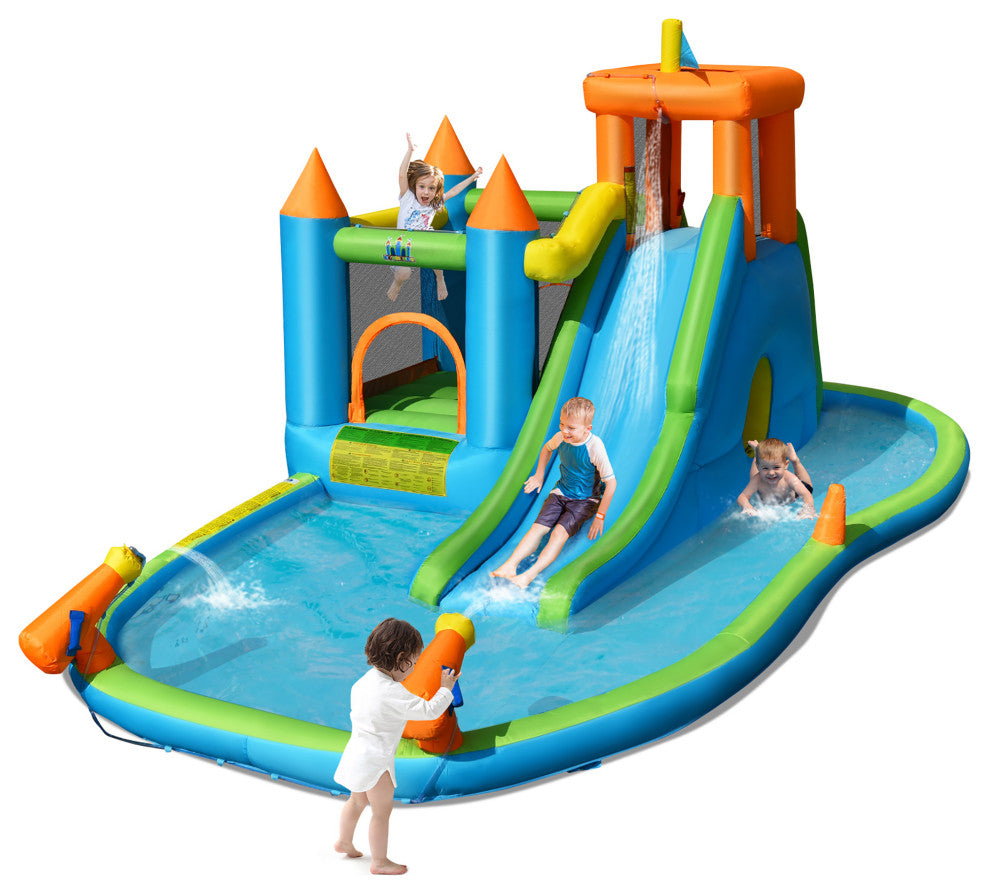 Our inflatable slide bouncer is a good choice for your kids to have fun. Equipped with a jumping bounce house, a basketball hoop, a long slide, a large splash pool, 2 water cannons, an ocean ball pit and a climbing wall, it provides kids with diverse pleasure. Long slide, splash water pool and water cannon allow children to enjoy water fun and feel cool in hot summer. The bouncer made of puncture-resistant ox ford fabric and PVC coat is wear-resistant and sturdy enough to ensure long service life. It can hold up to 330lbs, which is suitable for 6 kids to play at the same time. Safety netting protects kids'' safety. Besides, its compact size makes it easy to carry and store. It''s a good gift for kids to enjoy themselves.