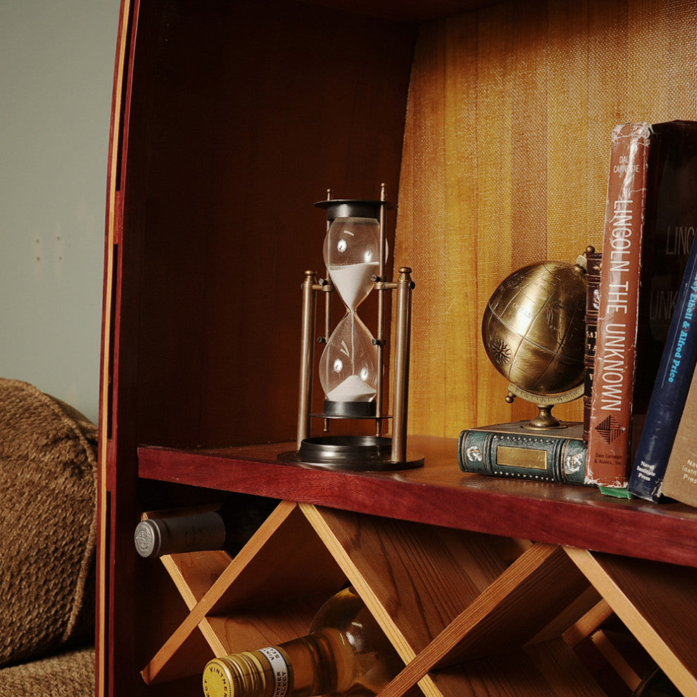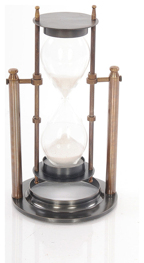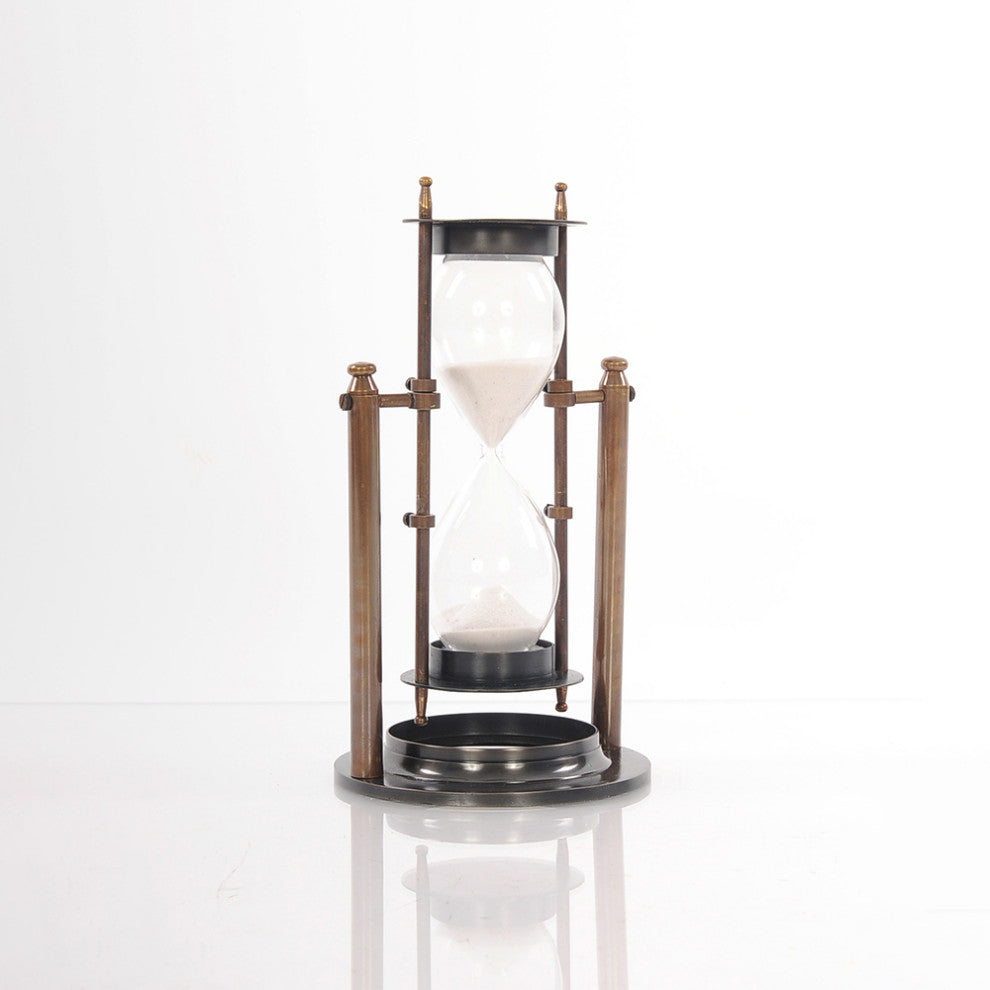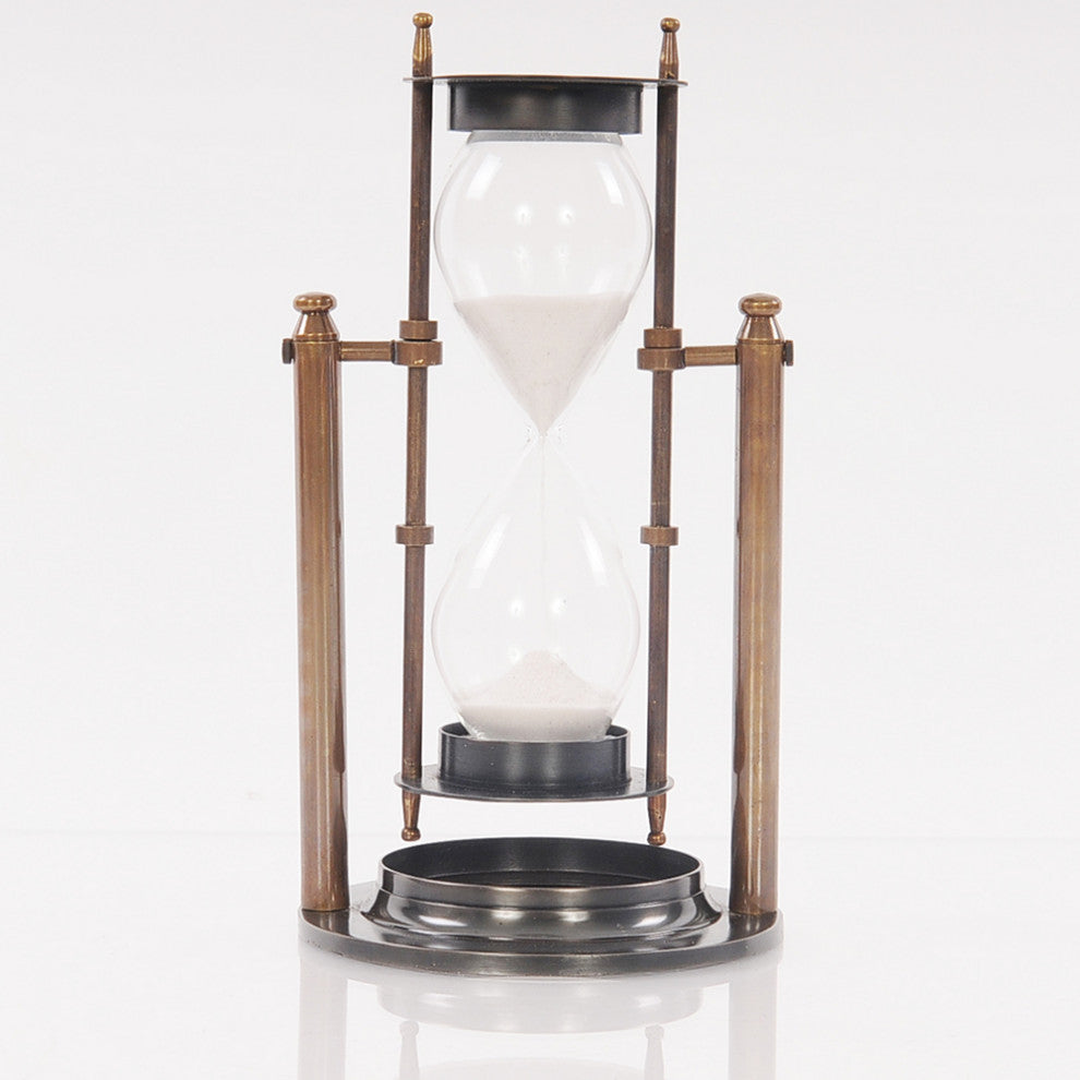The sand timer, more commonly referred to as the hourglass, is a device used to keep track of time. Minutes are measured as sand moves from bulb to bulb. During a voyage, the hour glass would be one of few reliable ways to measure time at sea alongside a compass to assist overall navigation. This brass, invertible hourglass stands on a metal base, navigating us through our days. Made out of brass with a two-tone antique finish Revolving sand timer