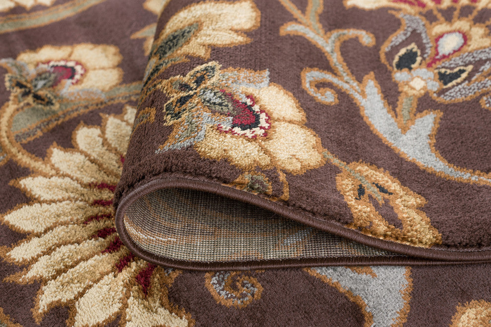 This transitional area rug has a gorgeous floral and paisley pattern on a rich sable brown background. The antique ivory