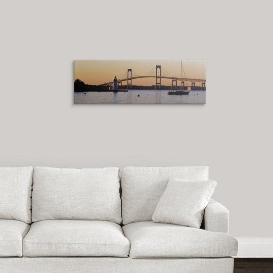 Gallery-wrapped canvas entitled, "Bridge Newport RI".Panoramic photograph of overpass in New York with lighthouse and boat in front of it at sunset.Our wrapped canvases feature a proprietary design that prevents warping or sagging over time. By using archival inks and artist-grade canvas, our premium canvases are sure to add that extra touch to any space. Lastly, our canvases are finished with a closed back that incorporates pre-installed hanging hardware for easy installation.