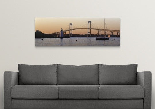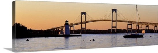 Gallery-wrapped canvas entitled, "Bridge Newport RI".Panoramic photograph of overpass in New York with lighthouse and boat in front of it at sunset.Our wrapped canvases feature a proprietary design that prevents warping or sagging over time. By using archival inks and artist-grade canvas, our premium canvases are sure to add that extra touch to any space. Lastly, our canvases are finished with a closed back that incorporates pre-installed hanging hardware for easy installation.