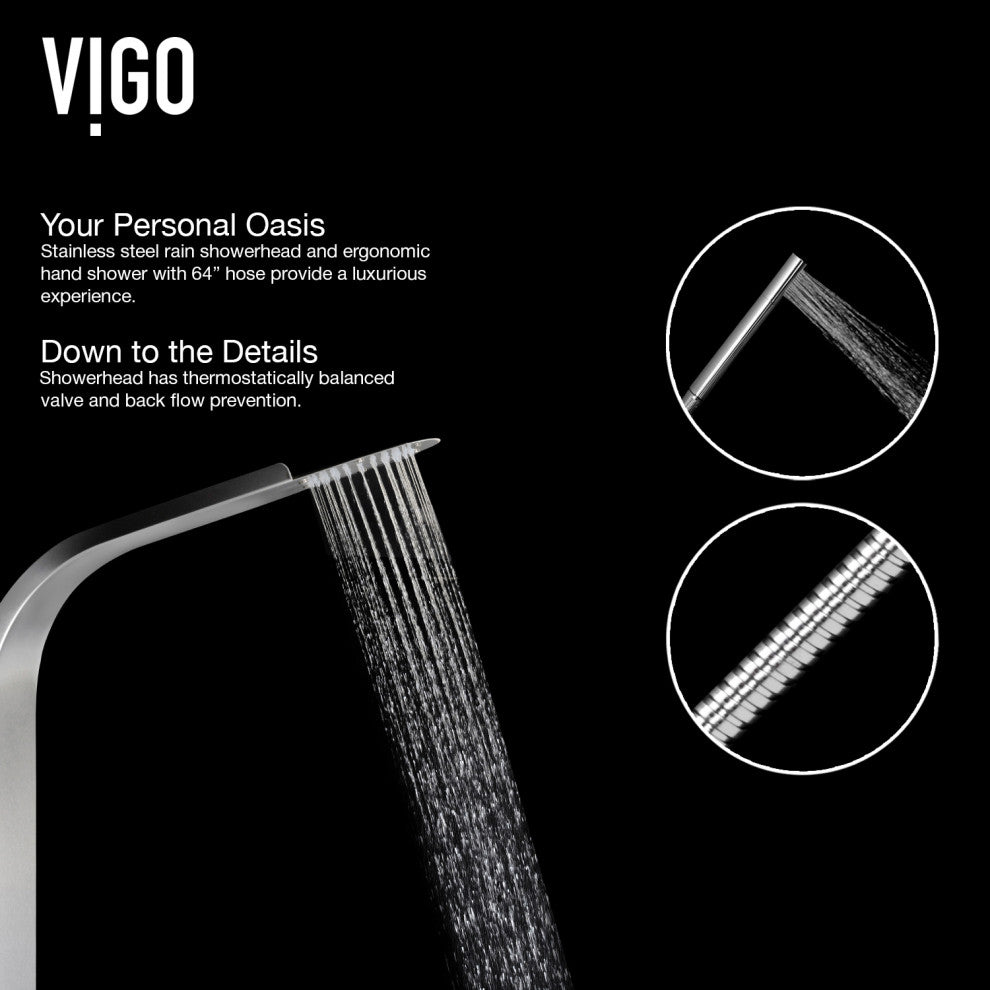 Transform your shower experience with the VIGO Brielle Stainless Steel Shower Massage Panel. Indulge in the luxury of six fully adjustable massage jets, a round rain showerhead, and a stainless steel hand shower with a 58-inch chrome finished brass hose for optimal maneuverability. This shower panel is pre-plumbed for easy installation and can be mounted on flat walls or corners. With solid brass hardware, a lightweight and durable 304-series stainless steel body, and rounded corners for safety, this shower panel is designed to last for years of daily use. The integrated thermostatic valve control ensures safe water temperatures and the ability to operate multiple functions simultaneously makes this shower panel a game-changer.Features:PRE-PLUMBED for easy installation on flat walls or corners;SOLID BRASS CONSTRUCTION for rust, corrosion, and tarnish resistance;LIGHTWEIGHT AND DURABLE 304-series stainless steel body for years of daily use;RAIN SHOWERHEAD for an even, perfect rinse or wash;ROUNDED CORNERS maintain optimal safety;EASY INSTALLATION with integrated rough-in valve and metal braided supply lines;THERMOSTATIC VALVE CONTROL guards against scalding and uncomfortable bursts of cold;MULTI-FUNCTIONAL with the ability to operate multiple functions simultaneously;6 FULLY ADJUSTABLE BODY SPRAY MASSAGE JETS to target all pressure points on the body;OPERATES AT A MAX 60 PSI for great pressure;MODERN AND ELEGANT with a versatile brilliant finish to look stunning in any bathroom setup;EASY TO CLEAN with a rust and corrosion-resistant 7-layer coated finish;USER-FRIENDLY SETUP with step-by-step installation instructions included.Measurements:Width: 6.38";Depth: 2.75";Height: 70.5".