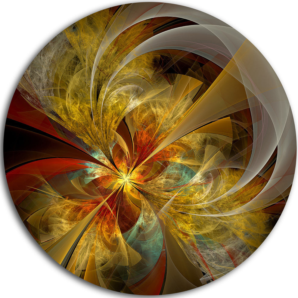 Bring Contemporary Abstraction to your home with this large Circle Metal wall art. This Bright Yellow Symmetrical Flower Design Metal Artwork makes it the focal point of any room or office.