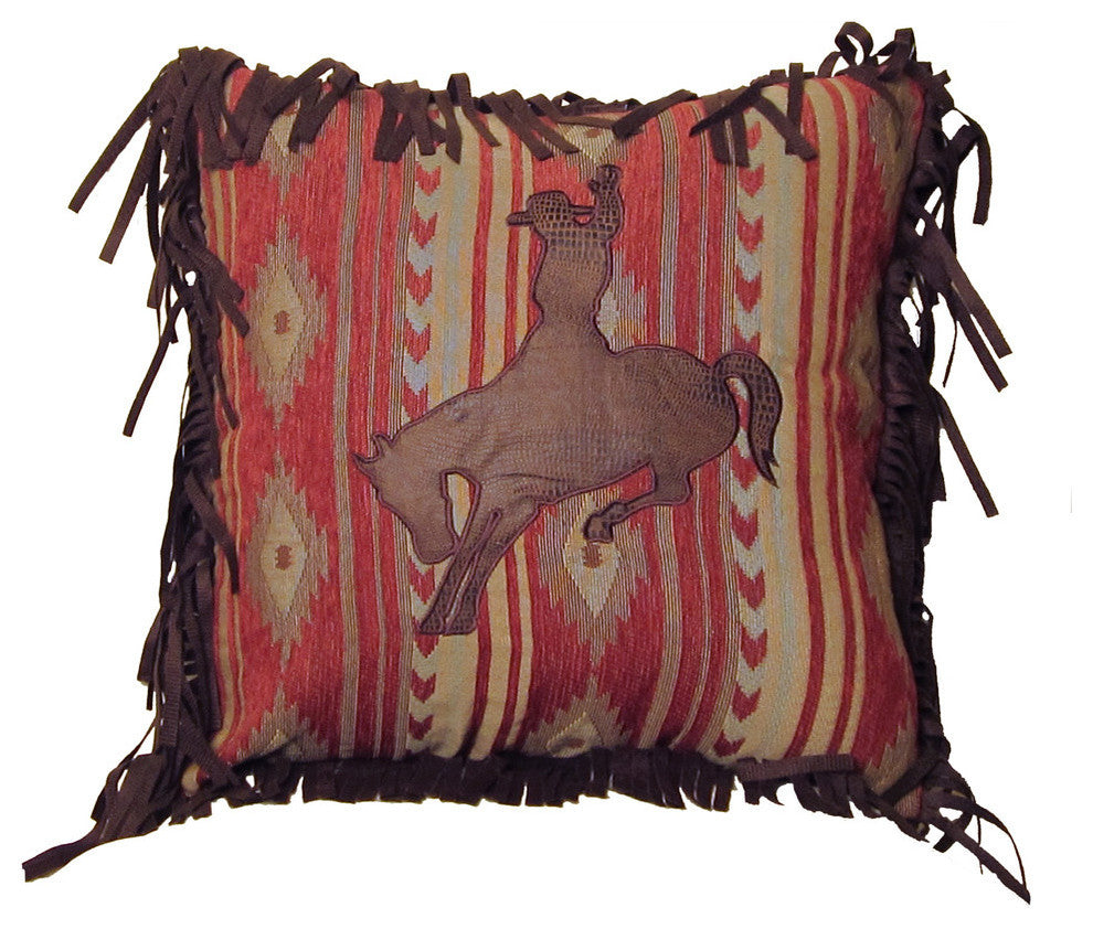 Take yourself to the wild, wild west with the Bronc Pillow from Carsten''s. This decorative pillow features flying horse fabric with faux leather fringe and an applique bronc rider. The pillow is sure to make a charming statement on a couch, bed or bench in your home.