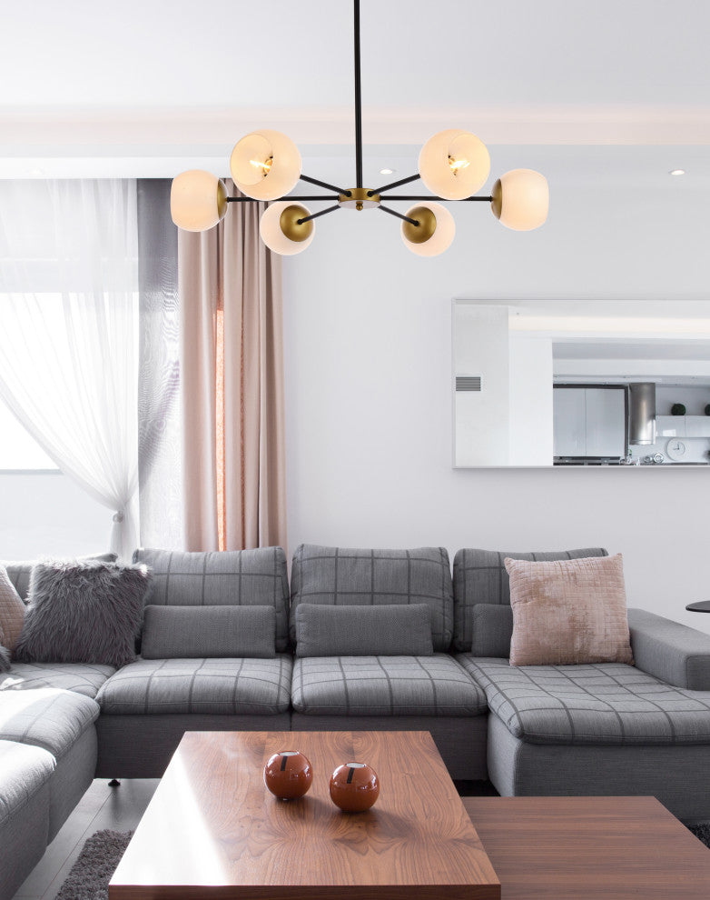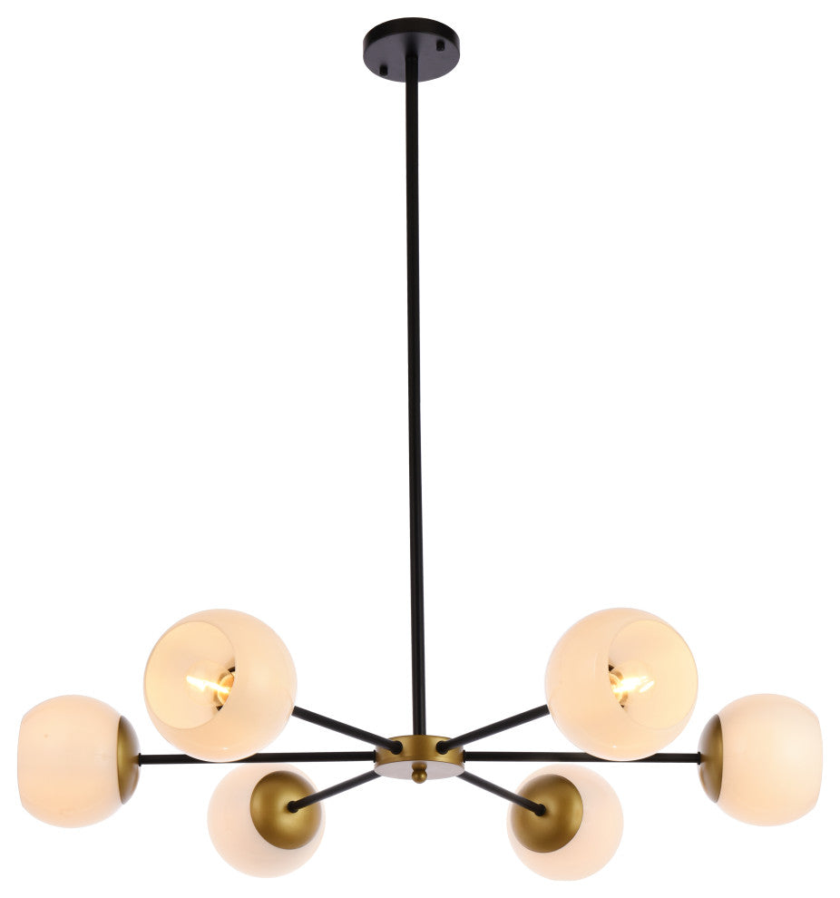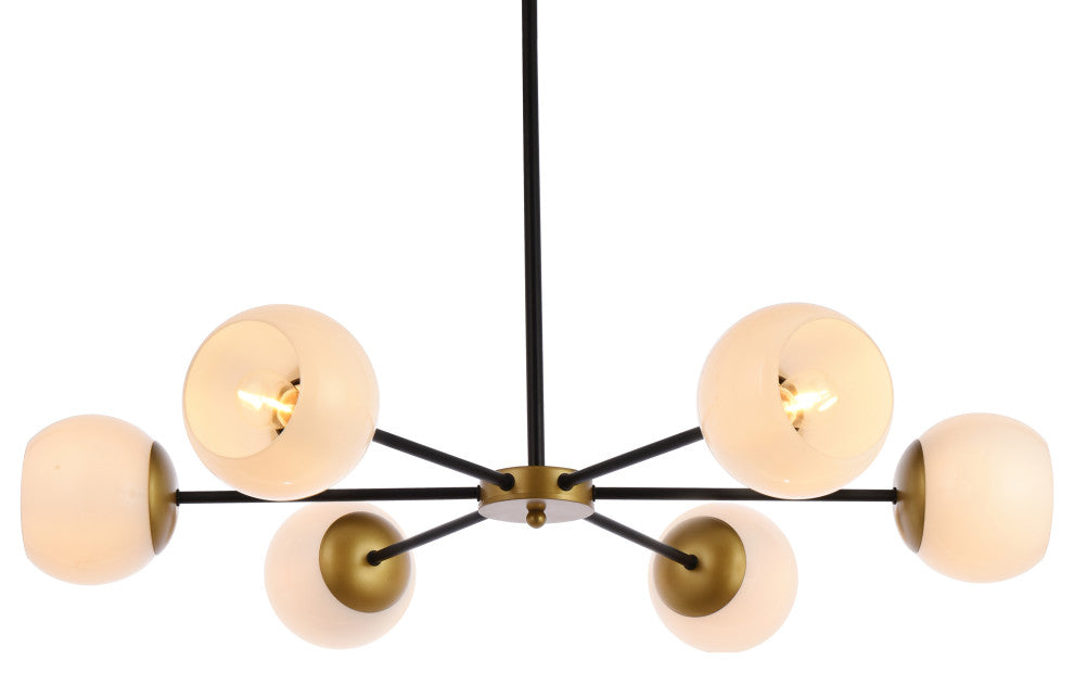This pendant illuminates in all directions, creating a wonderful display of artistic style and brilliance. If your home was a modern art exhibit, then you have curated the best possible piece of art. With six lights pointing in different directions, and the painted finish gleaming in modern beauty, you won''t have to worry about being "up to date" because you already are (light bulbs not included). This modern light fixture is adorned with spherical glass globes. The hardware finish brings an element of sophistication that can accentuate all styles of interior design.minimum hanging height of 10.8 inches and maximum hanging height of 50.8 inchessuspended from a hanging 46 inch long rodrequires 6 E26 bulbs (bulbs are not provided)assembly is not requiredcrafted from iron and glass6 lights that illuminate in all direction, fixture is dimmableideal for lighting for the kitchen, livingroom, office, hallway, and entryway