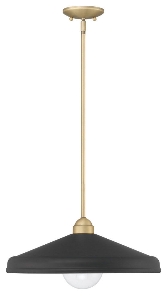 The classic style of Contemporary Farmhouse is embodied by the Brooks Barn Light Collection and the Brooks 18-inch Adjustable Barn Light 1-Light Pendant. With sleek features of a matte black dome exterior with gold leaf interior and included G40 globe bulb, use these pendants in pairs and trios over a kitchen island or dining table. Consider placing two or three throughout a living room at differing heights over a side table, book shelf, and coffee table for a playful visual dance through the room. 4-inch, 6-inch, 12-inch, and 18-inch rods for adjustable extension up to a 40-inch drop are included.