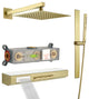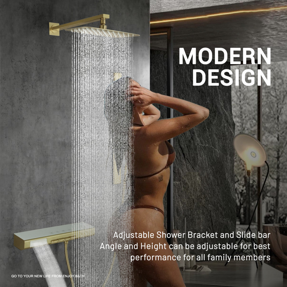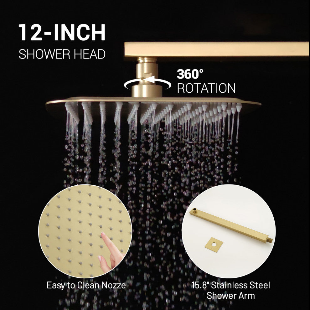 Luxury 12" Brushed Gold Rainfall Shower System with 2-in-1 Spray & Customizable Spa ExperienceUltimate Rainfall LuxuryImmerse yourself in a 12" UFO rain shower head designed to mimic natural rainfall. Its wide square panel delivers gentle, full-body coverage"”perfect for unwinding after a long day.Premium Brushed Gold EleganceUpgrade your bathroom with a scratch-resistant, fingerprint-proof brushed gold finish that blends seamlessly into modern or classic decor.2-in-1 Handheld Spray for Every NeedSwitch instantly between relaxing mist and high-pressure spray modes. Ideal for deep cleaning tiles, bathing pets, or quick rinses.Personalized Spa FeaturesAdjustable body jets: Target sore muscles with focused water streams.Waterfall spout: Enjoy a tranquil cascade flow for a luxurious soak.Stainless steel slide bar: Slide the handheld spray effortlessly to your ideal height.Smart Storage & DurabilityThe white glass valve top doubles as a shelf for shampoo or soap. Built with stainless steel hoses and corrosion-resistant brass cores, this system lasts for years.Why Choose This System?✅ Spa-Grade Versatility: Rainfall, handheld, waterfall, and body jets.✅ Commercial-Grade Materials: Rust-proof, leak-resistant, and tangle-free.✅ Space-Saving Design: Sleek concealed valves maximize bathroom space.✅ 24/7 Support: Backed by a satisfaction guarantee and responsive service.Tech SpecsShower Head: 12" UFO rain panelFinish: Brushed Gold (anti-tarnish coating)Spray Modes: Rainfall / Mist / High-Pressure / WaterfallIncluded: Slide bar, 59" stainless hose, valve with glass shelf
