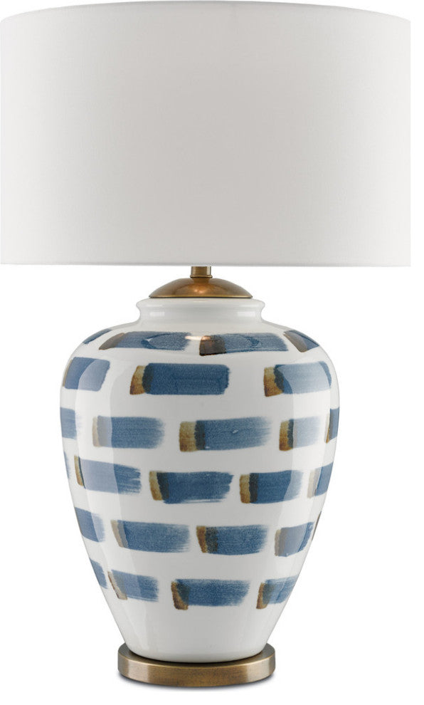 Royal blue swaths of paint tipped with a daub of smoky brown intermingle to ornament the oversized urn-style Brushstroke table lamp. White ceramic is the perfect canvas for the artisanal touch, the antique brass hardware echoing the tones in the brown accents. The buxom lamp, which stands 33" tall, has been topped with an equally voluptuous white linen shade to bring a painterly charm to a room.Fixture Type: PortableNumber of Lights: 1 LightBulb Type: A Standard BulbMaximum Watts per Item: 150Maximum Watts per Socket: 150Socket Type: Standard Base E26Voltage: 120vSwitch Type: Turn KnobWire Color: SilverCord Length: 8''Harp Finish: BrassHarp Size: 9.5"Shade Detail: White LinenShade Height: 11.5"HShade Top Diameter: 20Shade Bottom Diameter: 20"Neck Height: 2"Base Height: 1"Base Diameter: 8Body Diameter: 13.75Body Height: 18.25"