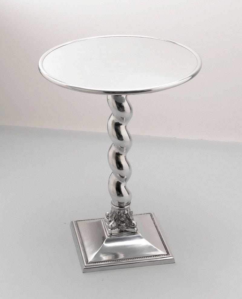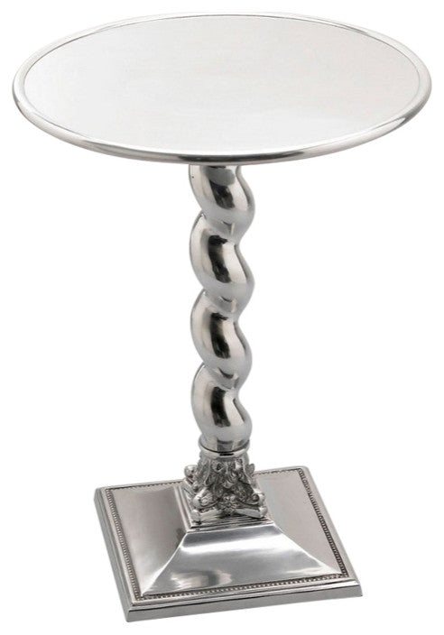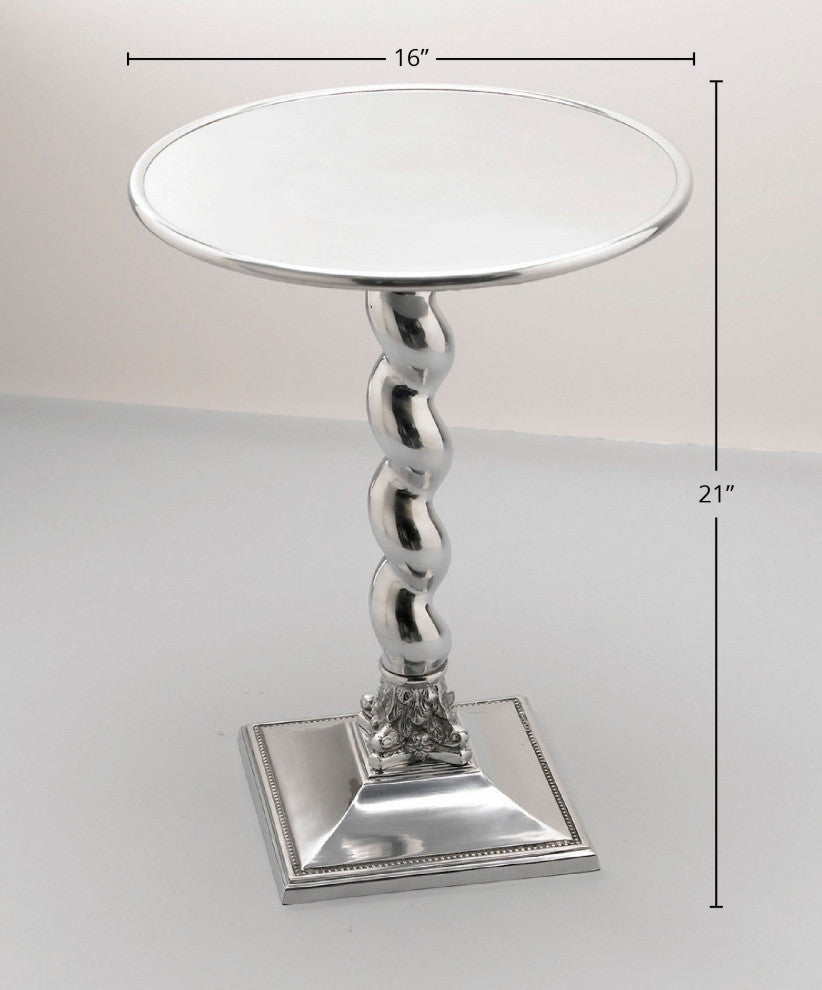 The Bucareli Metal End Table features a sleek, modern design. Made from durable metal with a polished silver finish, this table brings a refined, contemporary touch to any space. Its round tabletop provides ample space for table lamps, books, decorative accents, or even drinks and small plates, making it both stylish and functional. The twisted pedestal base adds a sculptural element, enhancing its visual appeal. Whether beside a sofa, next to a bed, or in a cozy reading nook, the Bucareli End Table is a perfect fit.Features:Overall product dimensions are 16" W x 16" D x 21" HCrafted from premium metal for long-lasting useSpacious round tabletop designOptimal height (21"), perfect for placement beside sofas, armchairsFunctions as an end table, nightstand, or display stand for decorDimensions:End TableAssembled Product: 16 inches wide x 16 inches deep x 21 inches high.