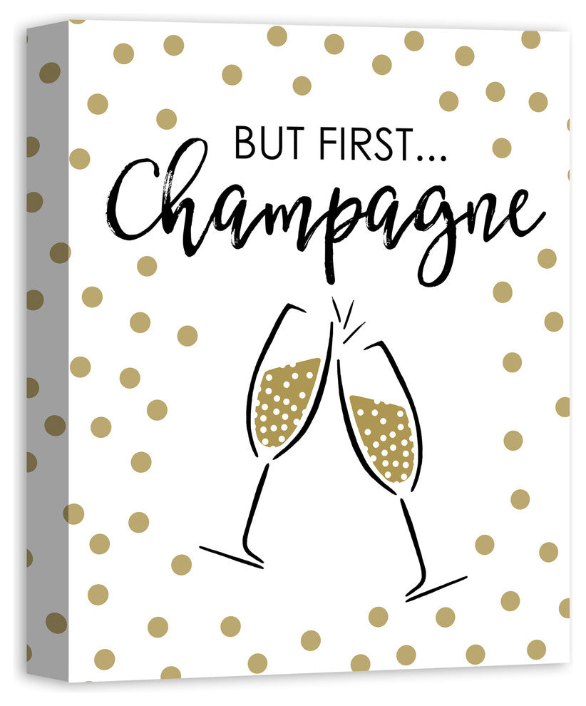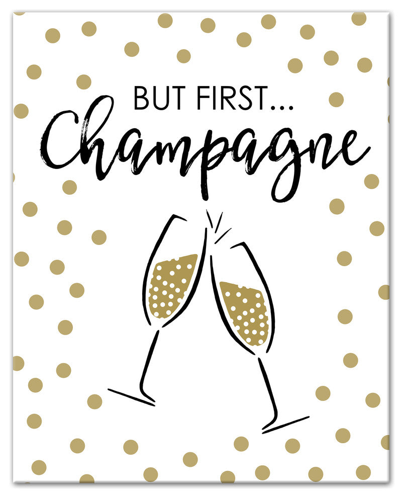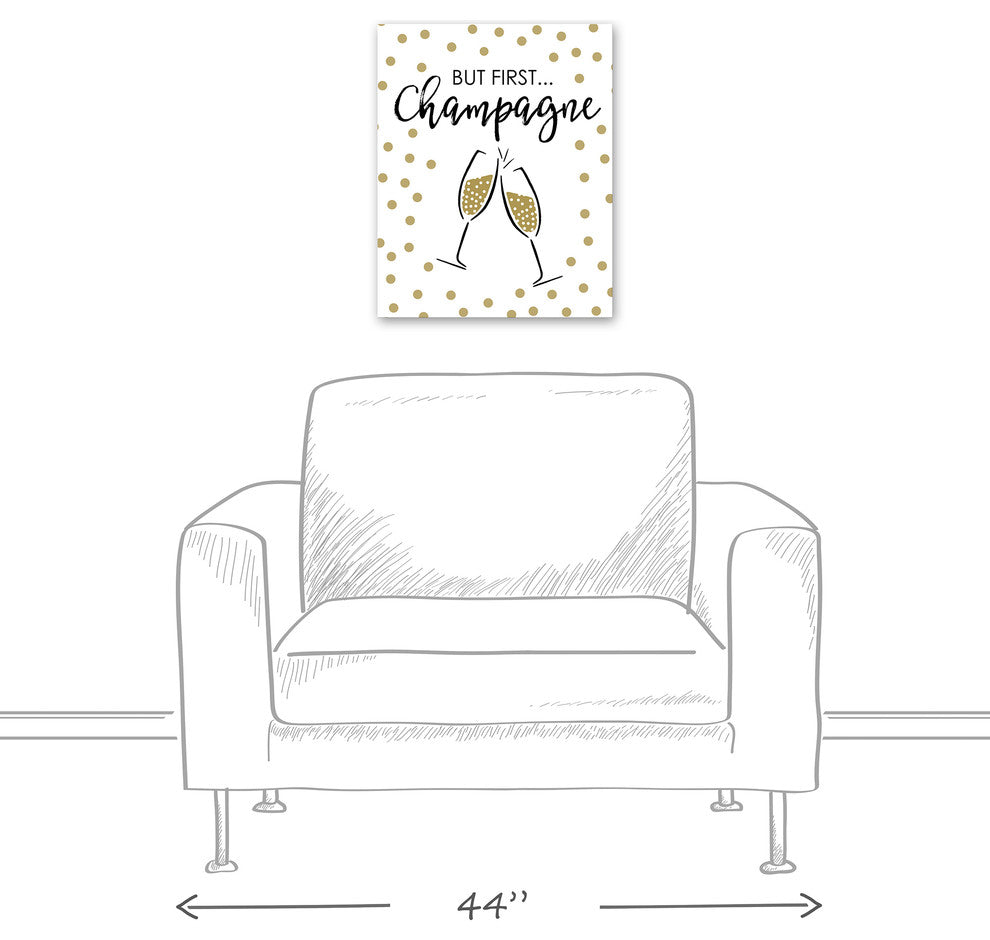 Add a little humor to your walls with the But First Champagne Canvas Wall Art. This premium gallery wrapped canvas features champagne glasses over a gold dot background with black text that reads "But First Champagne". The wall art is printed on professional grade tightly woven canvas with a durable construction, finished backing, and is built ready to hang. The result is a funny piece of wall art that is perfect for your bar, kitchen, gallery wall or above your bar cart. This piece makes a great gift for any champagne lover.