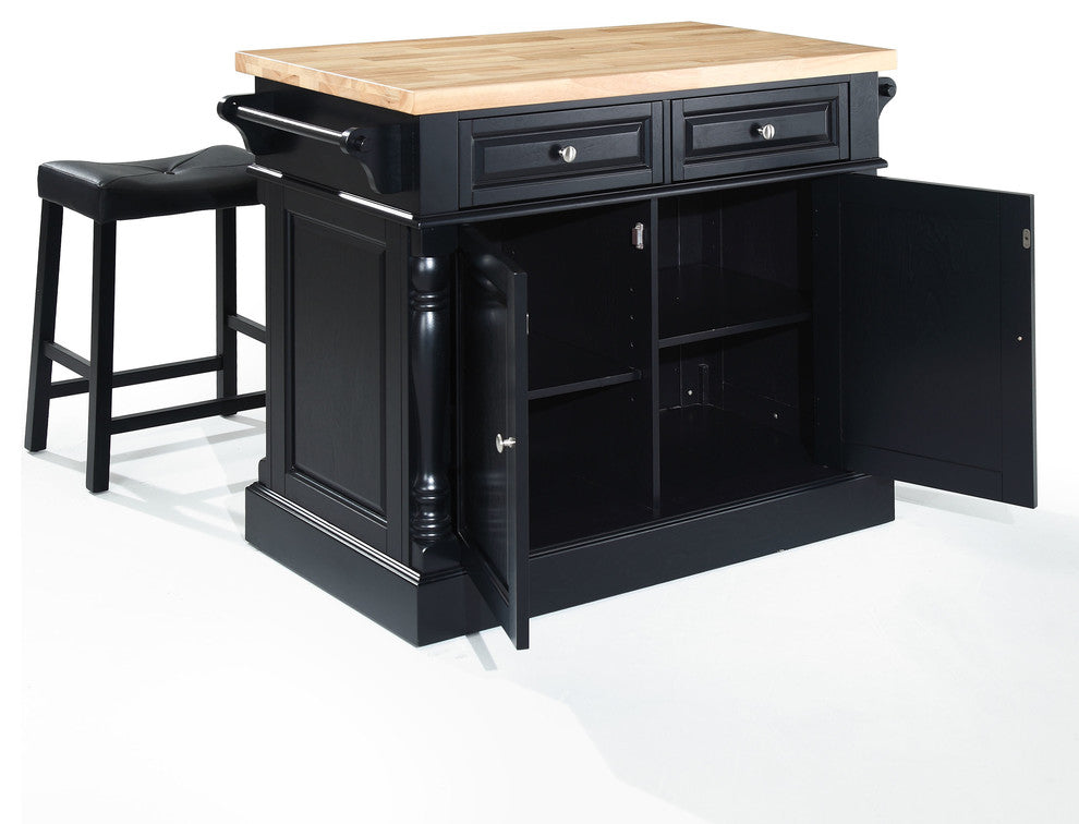 Butcher Block Top Kitchen Island, Black Finish With 24" Black Upholstered Sadd