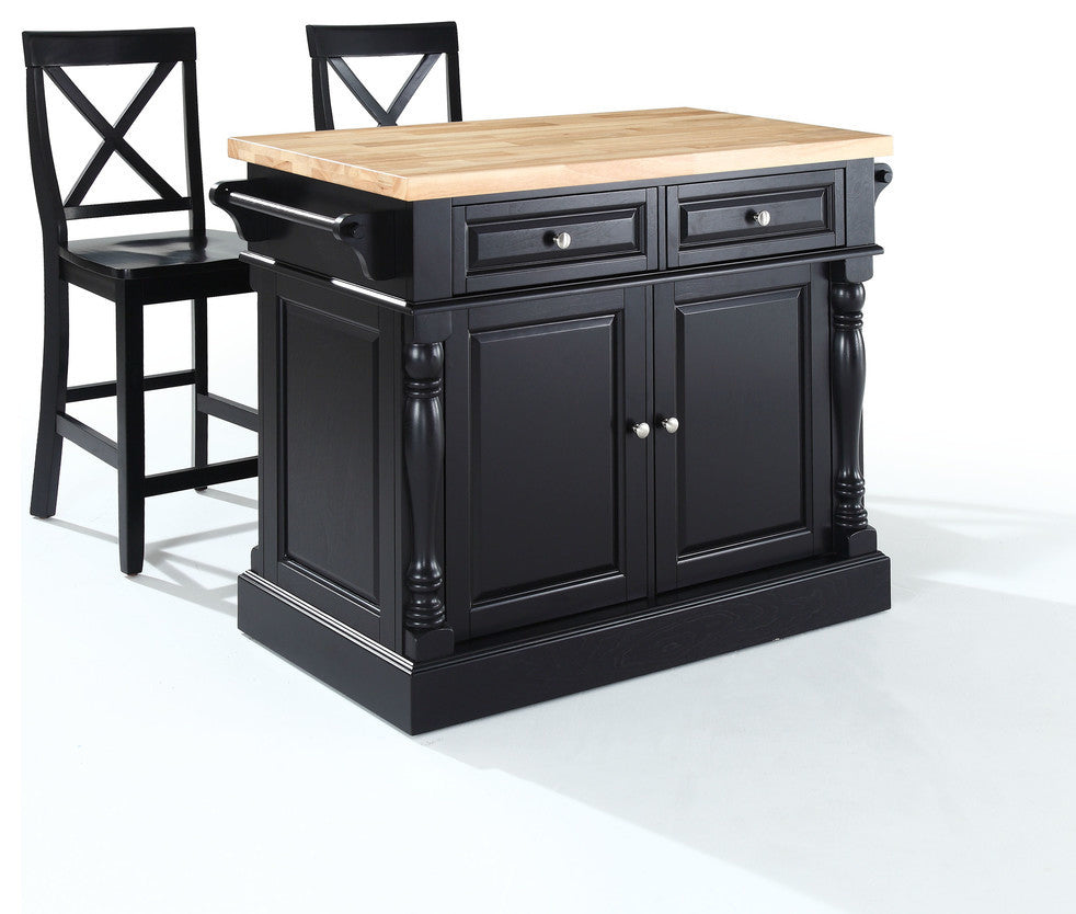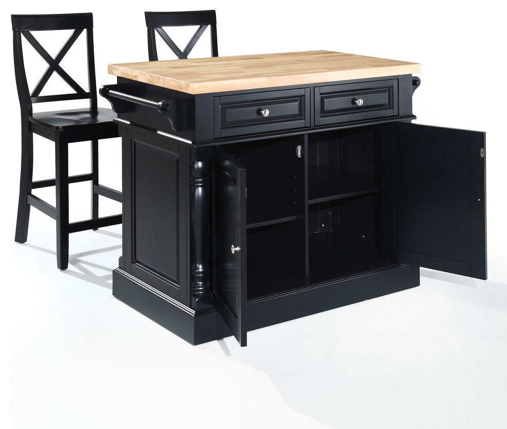 Butcher Block Top Kitchen Island in Black Finish With 24"x-Back Stools