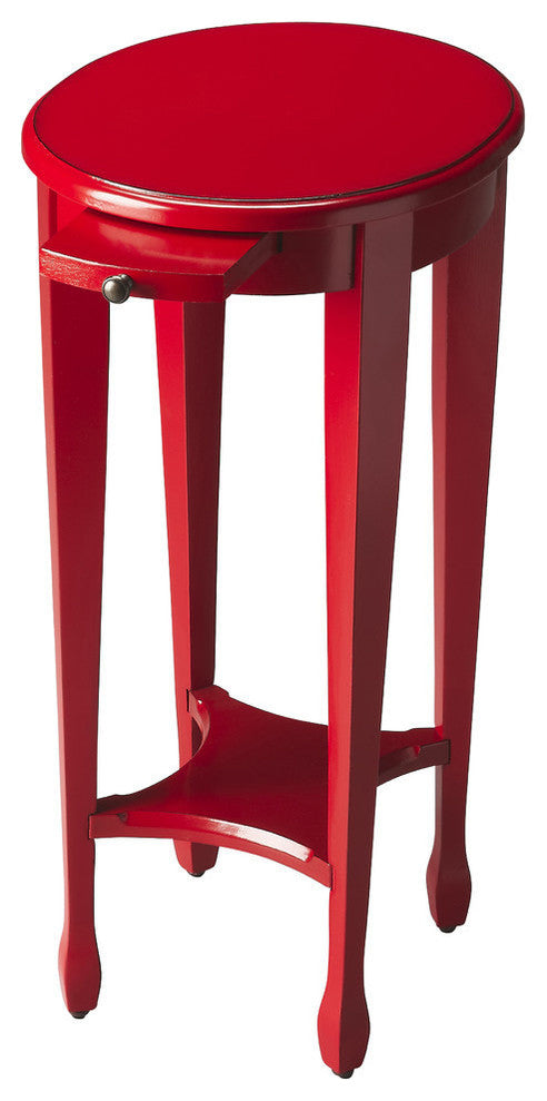This bold red accent table is hand crafted from poplar hardwood solids and wood products. Perfectly proportioned to sit beside an easychair or serve as a bedside table, it features a matched birch veneer top with a birch veneer lower shelf and pull out drink tray with antique brass finished hardware.