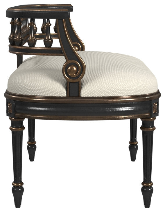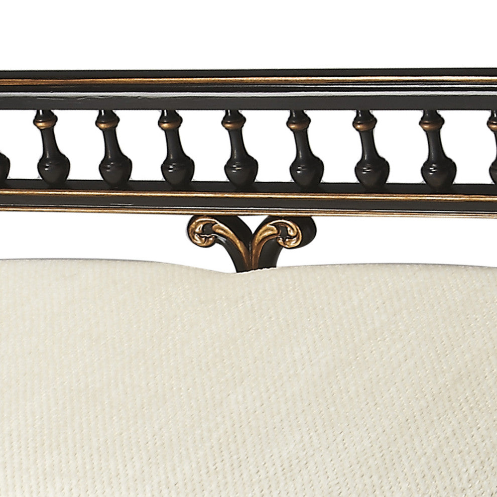 This beautifully hand-painted bench in a Cafe Noir finish will infuse elegance into virtually any traditional space. Handcrafted from rubber wood solids and wood products, it features a carved spindle back, fluted legs and ballerina feet. The generously sized seat cushion is upholstered in an ivory cotton hobnail fabric.
